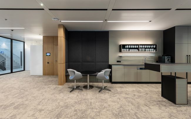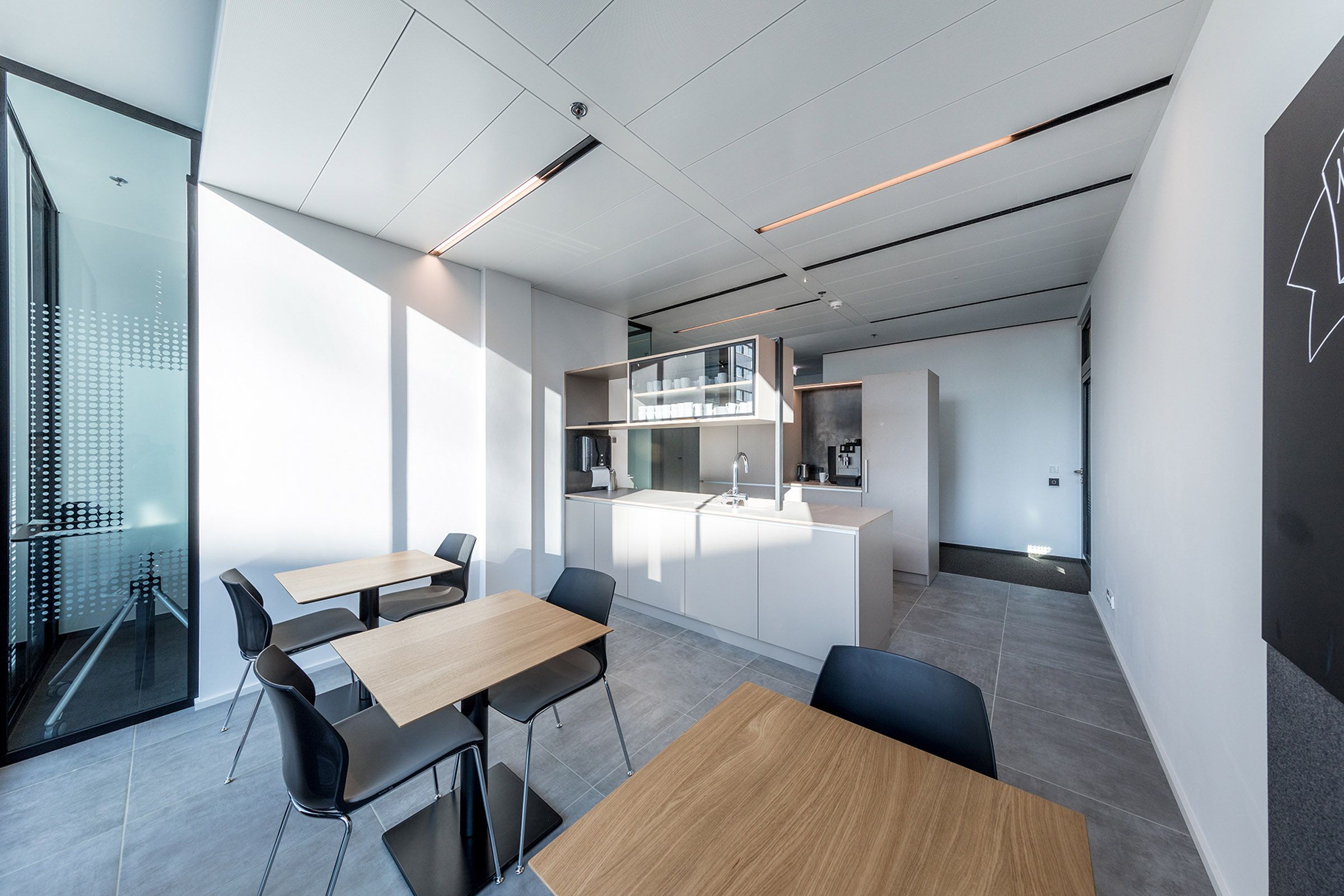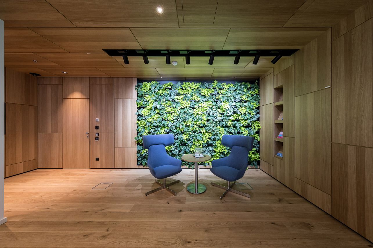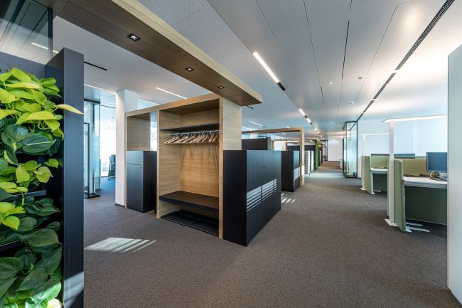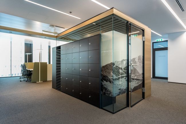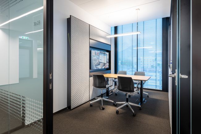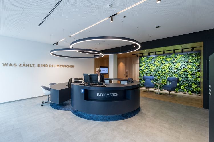 Unter besonderer Berücksichtigung der Raumakustik wurden unterschiedlichste visuelle Raumbeziehungen innerhalb und auch zwischen den Organisationseinheiten hergestellt. Durch die geschickte Anordnung verschiedenster Möbel- und Trennwandkonfigurationen kommt trotz des offenen Raumkonzeptes die Privatsphäre der Mitarbeiterinnen und Mitarbeiter nicht zu kurz, um ein ungestörtes Arbeiten alleine, in kleinen oder in größeren Gruppen zu ermöglichen. Neben den fix zugeteilten Arbeitsplätzen stehen auch temporär nutzbare Arbeitstische, eigens abgetrennte Telefonräume, multifunktional ausgestattete Besprechungs- und Konferenzräume in unterschiedlichen Größen sowie ein kreativ gestalteter Loungebereich mit Dachgarten zum informellen Austausch zur Verfügung.