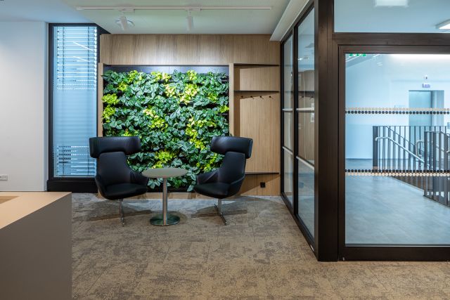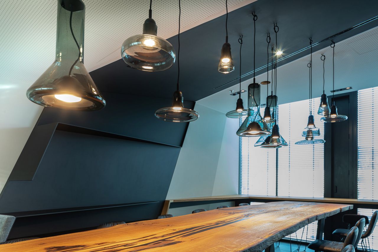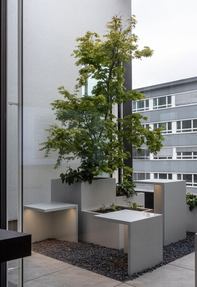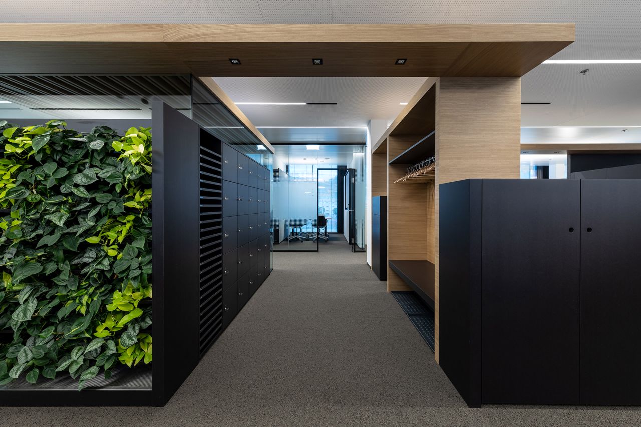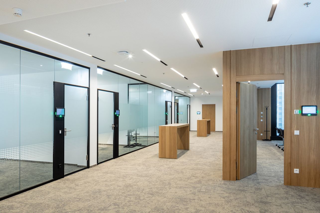 Unter besonderer Berücksichtigung der Raumakustik wurden unterschiedlichste visuelle Raumbeziehungen innerhalb und auch zwischen den Organisationseinheiten hergestellt. Durch die geschickte Anordnung verschiedenster Möbel- und Trennwandkonfigurationen kommt trotz des offenen Raumkonzeptes die Privatsphäre der Mitarbeiterinnen und Mitarbeiter nicht zu kurz, um ein ungestörtes Arbeiten alleine, in kleinen oder in größeren Gruppen zu ermöglichen. Neben den fix zugeteilten Arbeitsplätzen stehen auch temporär nutzbare Arbeitstische, eigens abgetrennte Telefonräume, multifunktional ausgestattete Besprechungs- und Konferenzräume in unterschiedlichen Größen sowie ein kreativ gestalteter Loungebereich mit Dachgarten zum informellen Austausch zur Verfügung.