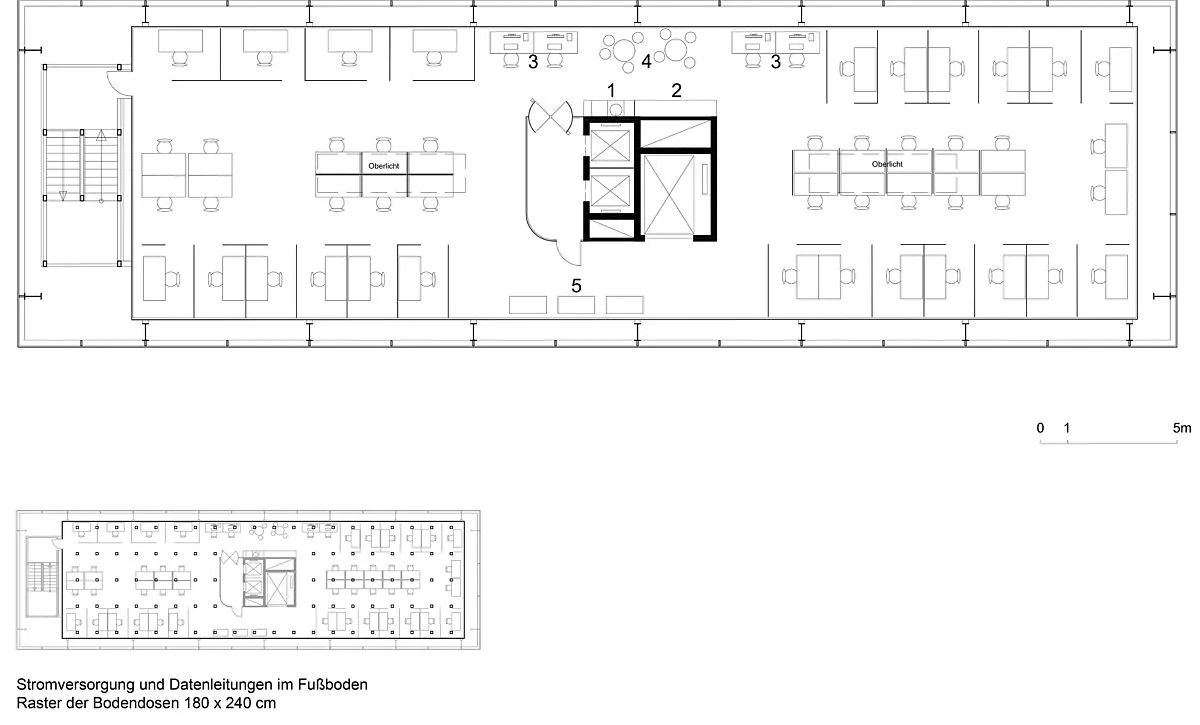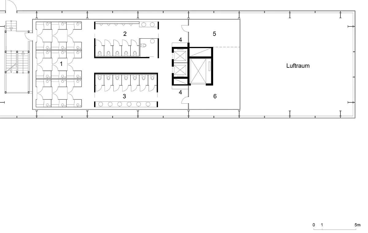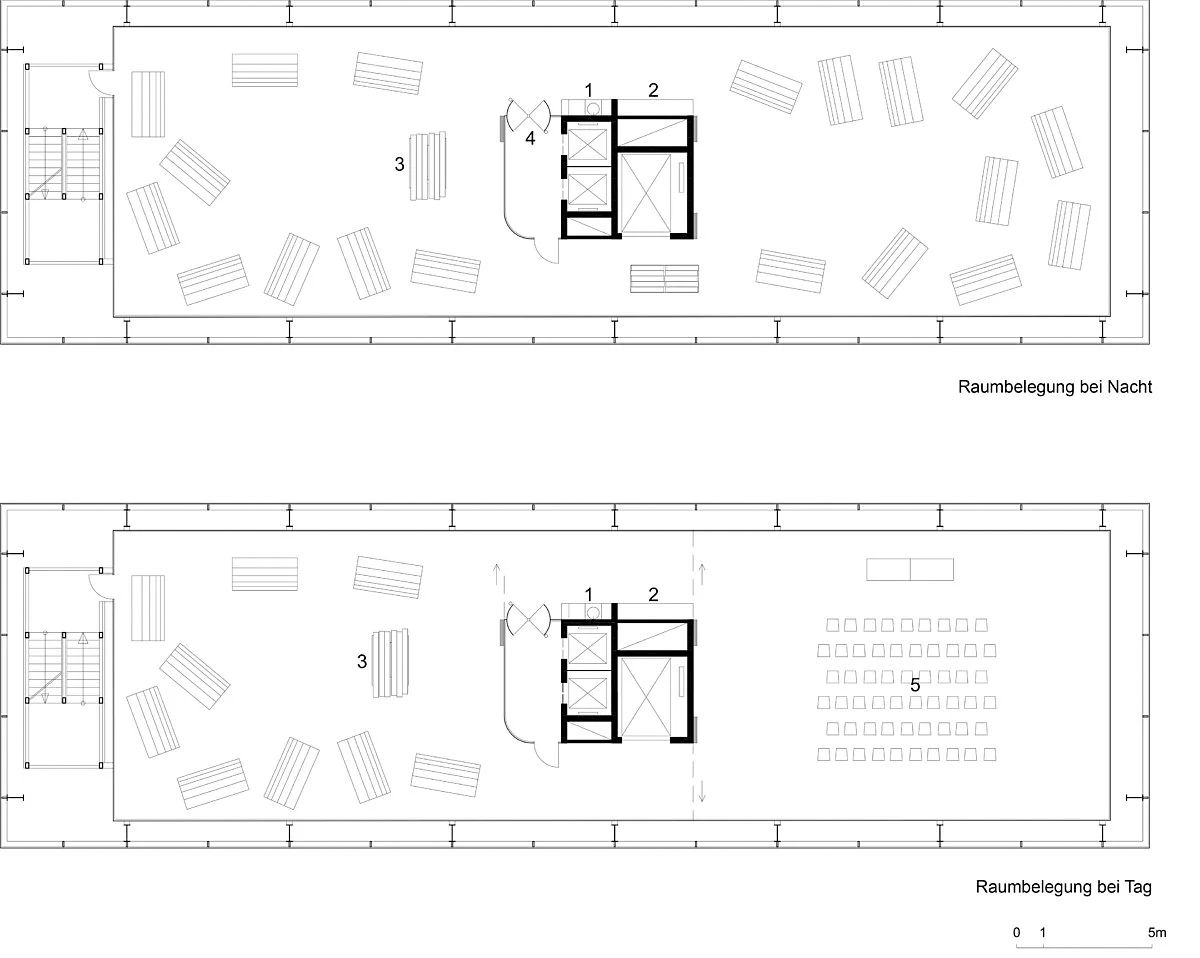 Nachts, bzw. bei großer Nachfrage steht das gesamte Geschoß zum Schlafen zur Verfügung. Tagsüber, oder zu wenig frequentierten Zeiten, kann der Raum mit Schiebewänden geteilt werden. Der Schlafbereich wird somit kleiner, und ein zweiter, frei bespielbarer Raum entsteht. Mögliche Nutzungen sind beispielsweise Seminare oder Schulungen. Durch die bestehende Versorgungseinheit mit Wasser, Getränkeautomat und Kühlschrank und durch ein enges Steckdosenraster am Fußboden sind sehr viele Bespielungen denkbar.