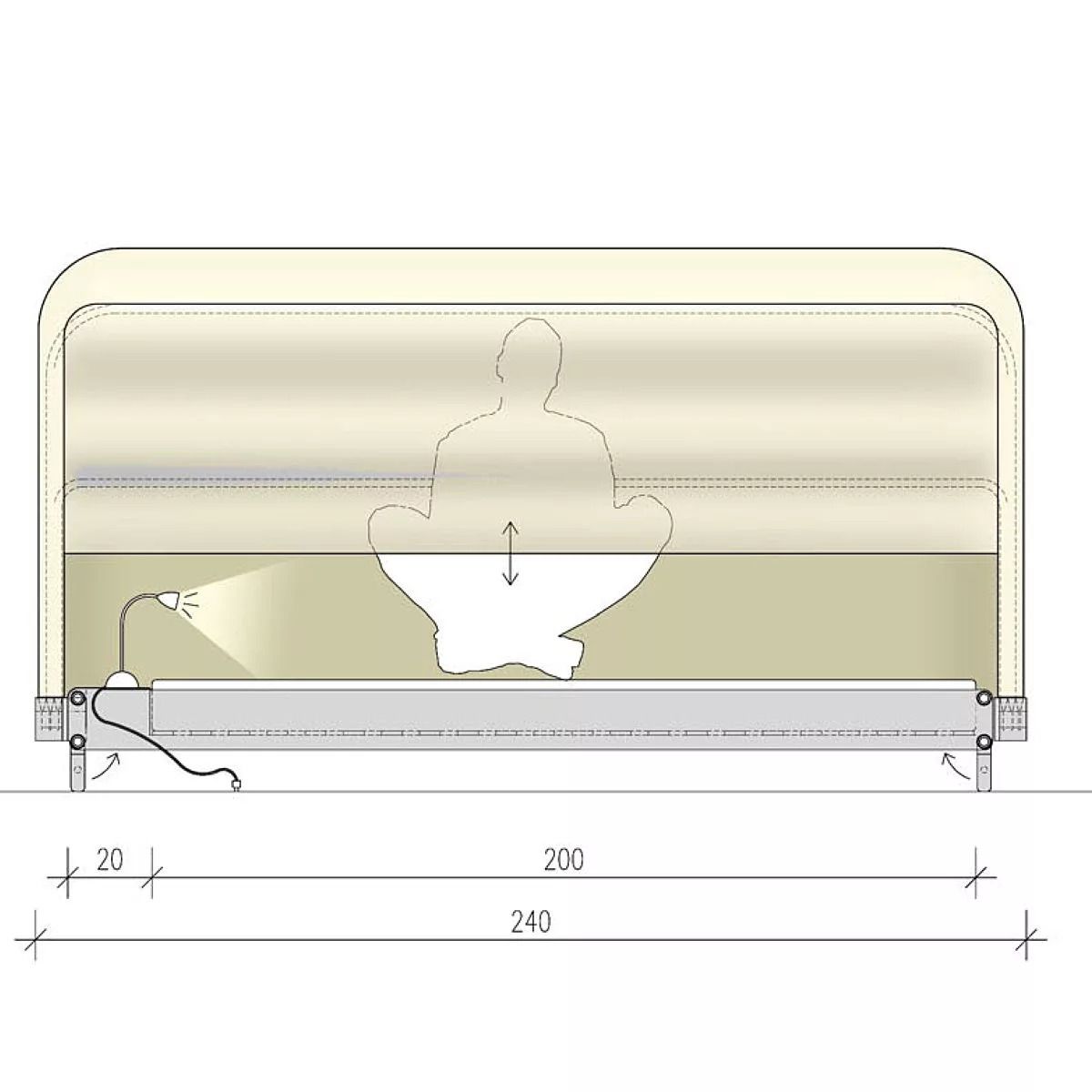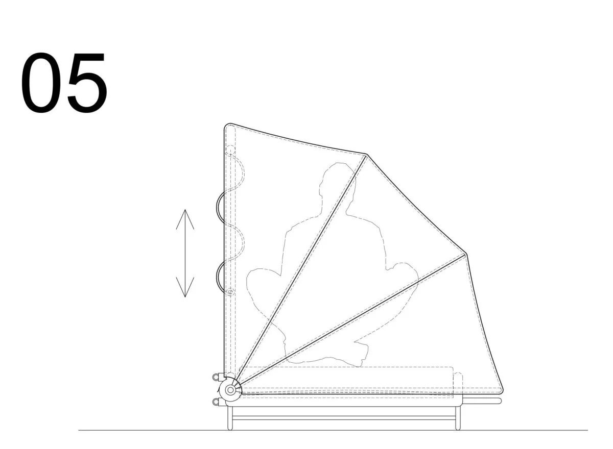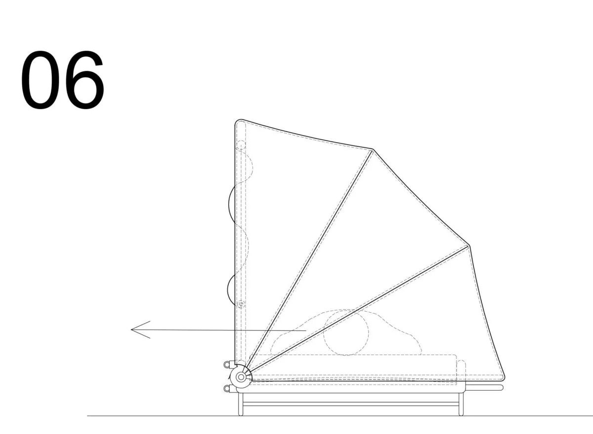 Das Bett steht fertig am Boden, die Fixierung der Bügel wird gelöst und das Faltdach kann geöffnet werden.