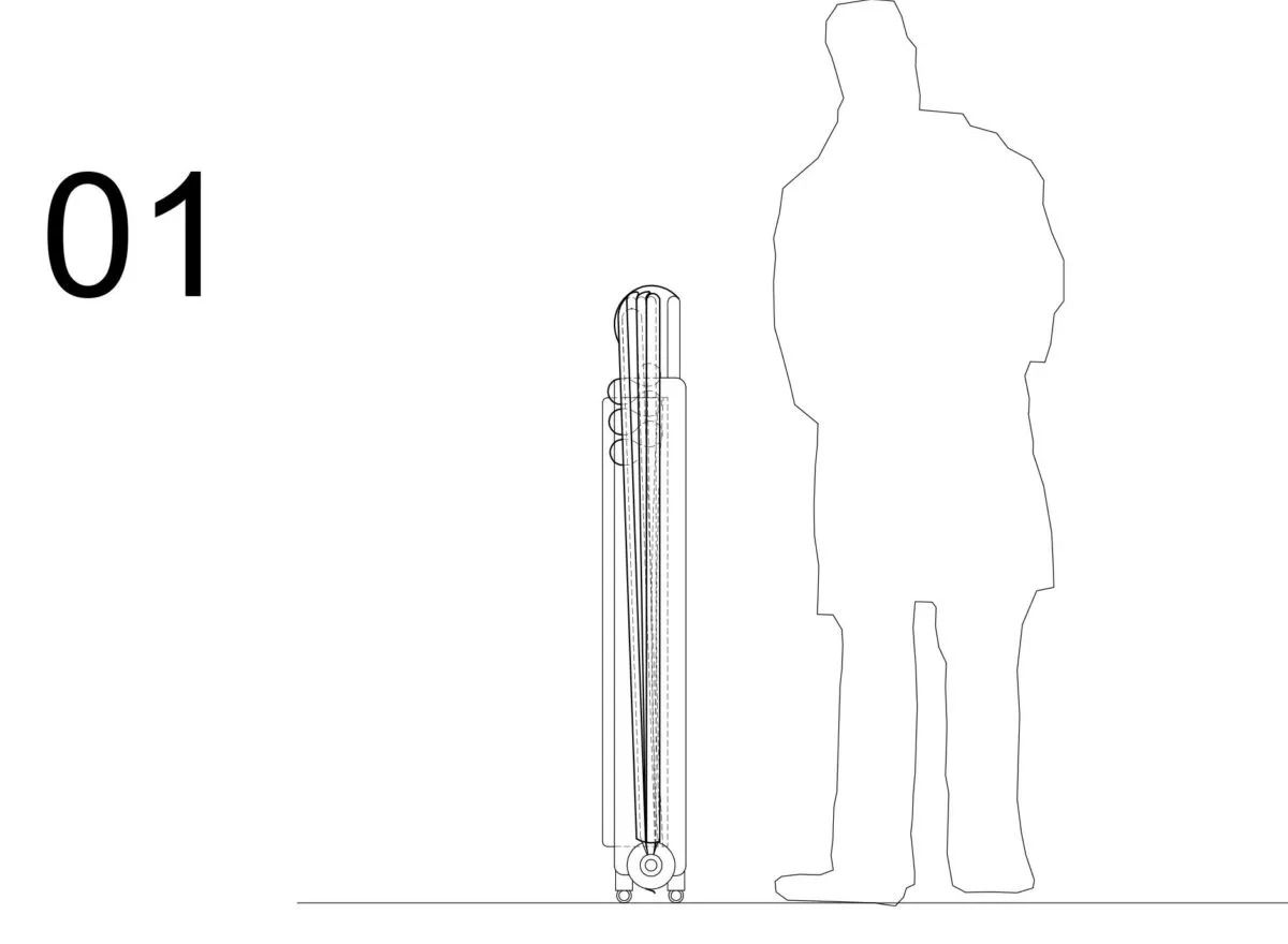 Space Capsule zusammengelegt. Haltegriffe an beiden Enden des oberen Bügels erleichtern das Umherrollen im Raum.
