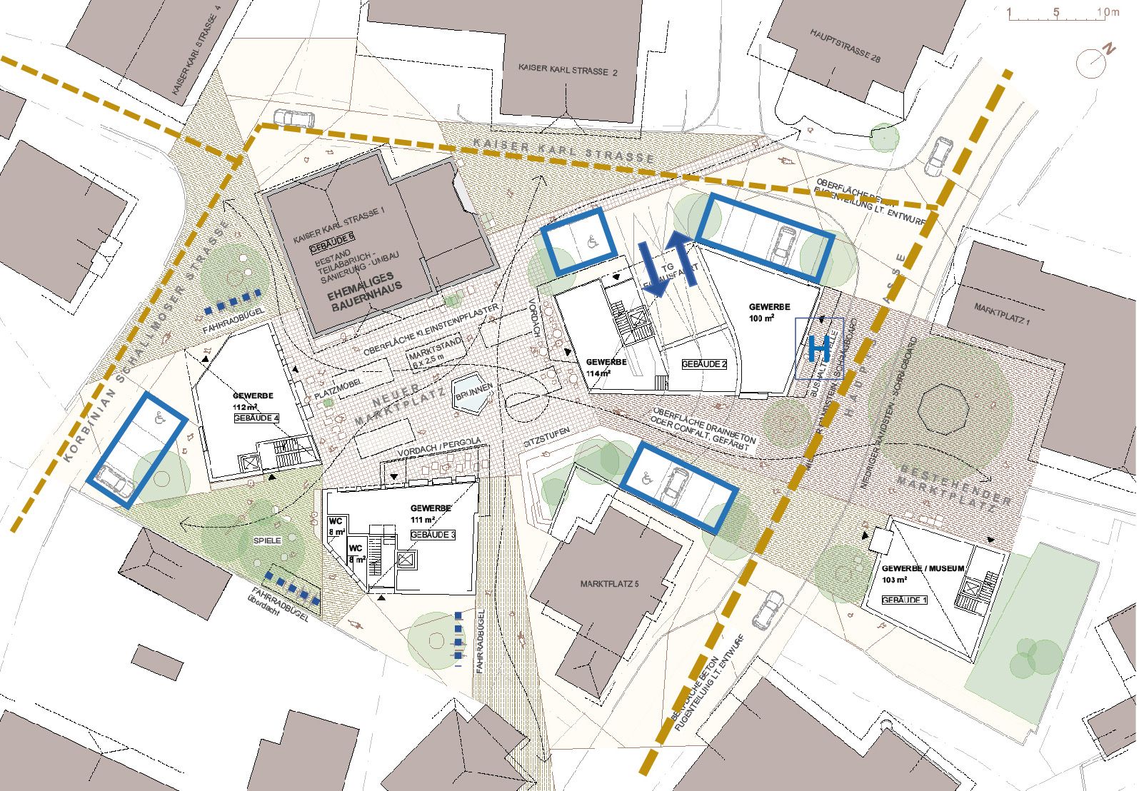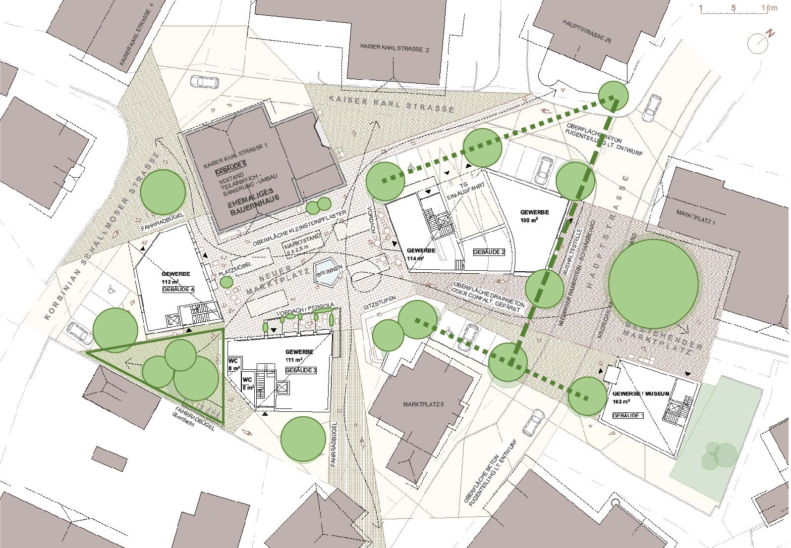 Über Sichtachsen, Baumreihen und Oberflächengestaltung werden Beziehungen zum neuen Marktplatz hergestellt, welcher sich von der Straße abgerückt, in etwas ruhigerer Lage befindet. Der bestehende Brunnen wird hier wieder errichtet.