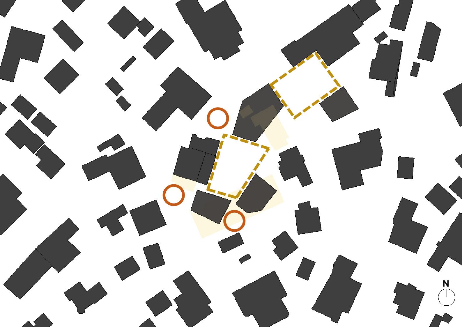 Auf dem bestehenden Marktplatz soll daher ein freistehender, skulpturaler Baukörper mit öffentlicher Nutzung (z.B. Museum) entstehen. Die Platzwirkung um den bestehenden Kastanienbaum wird durch den neuen Baukörper verstärkt, die Proportionen werden stimmig.