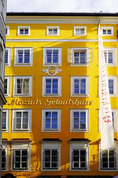 Eine Fahne aus weißem Segeltuch durchsetzt mit transparenten, rot schimmernden Noten – Notenflug. KV 265 ist eine Intervention von dem Salzburger Künstler Andreas Feldinger.