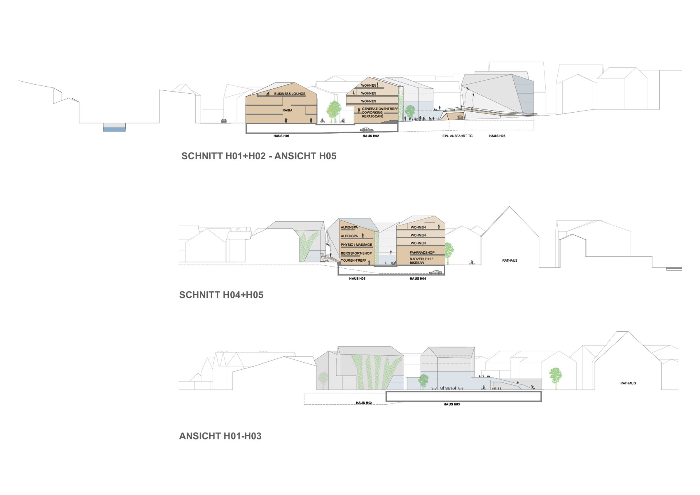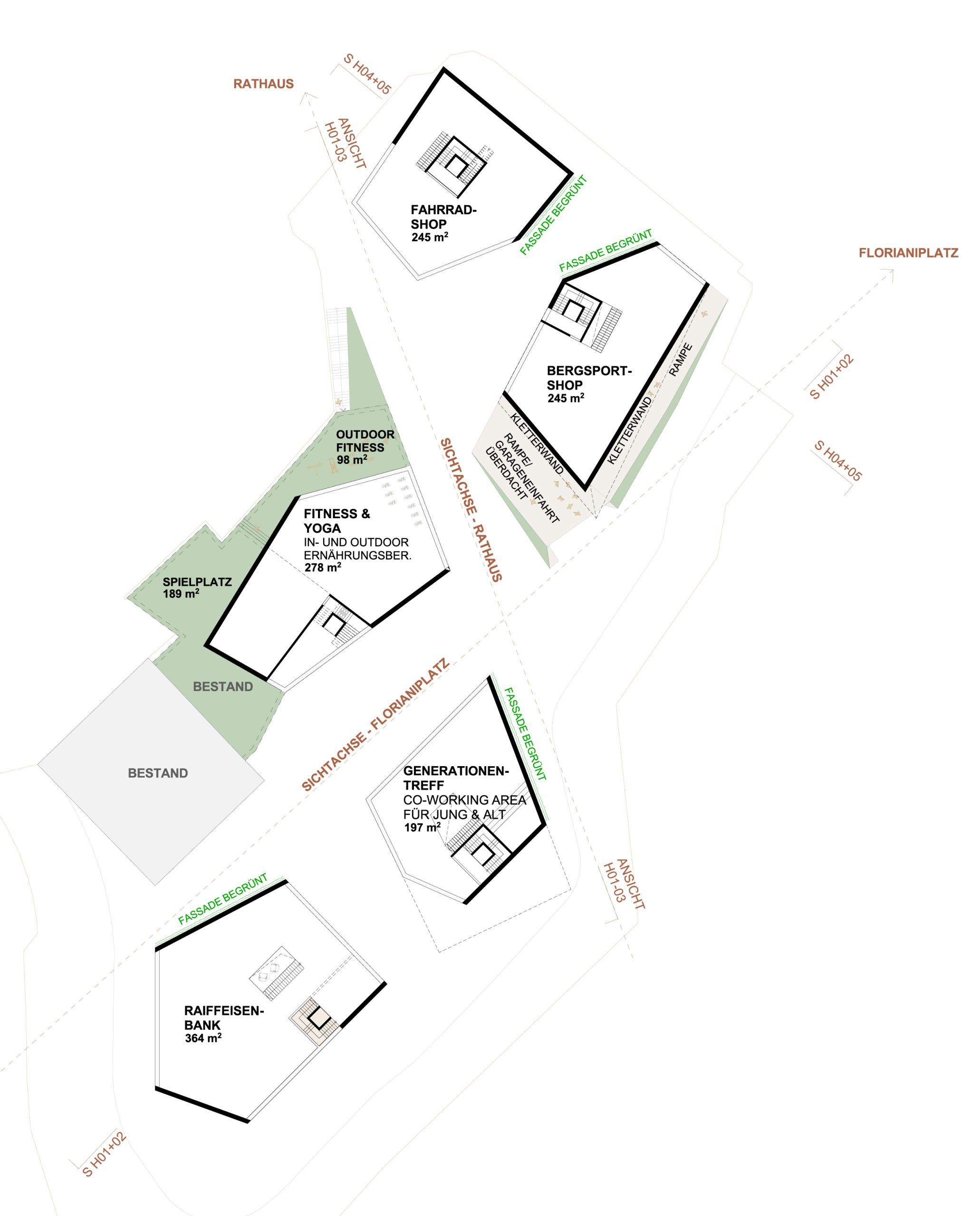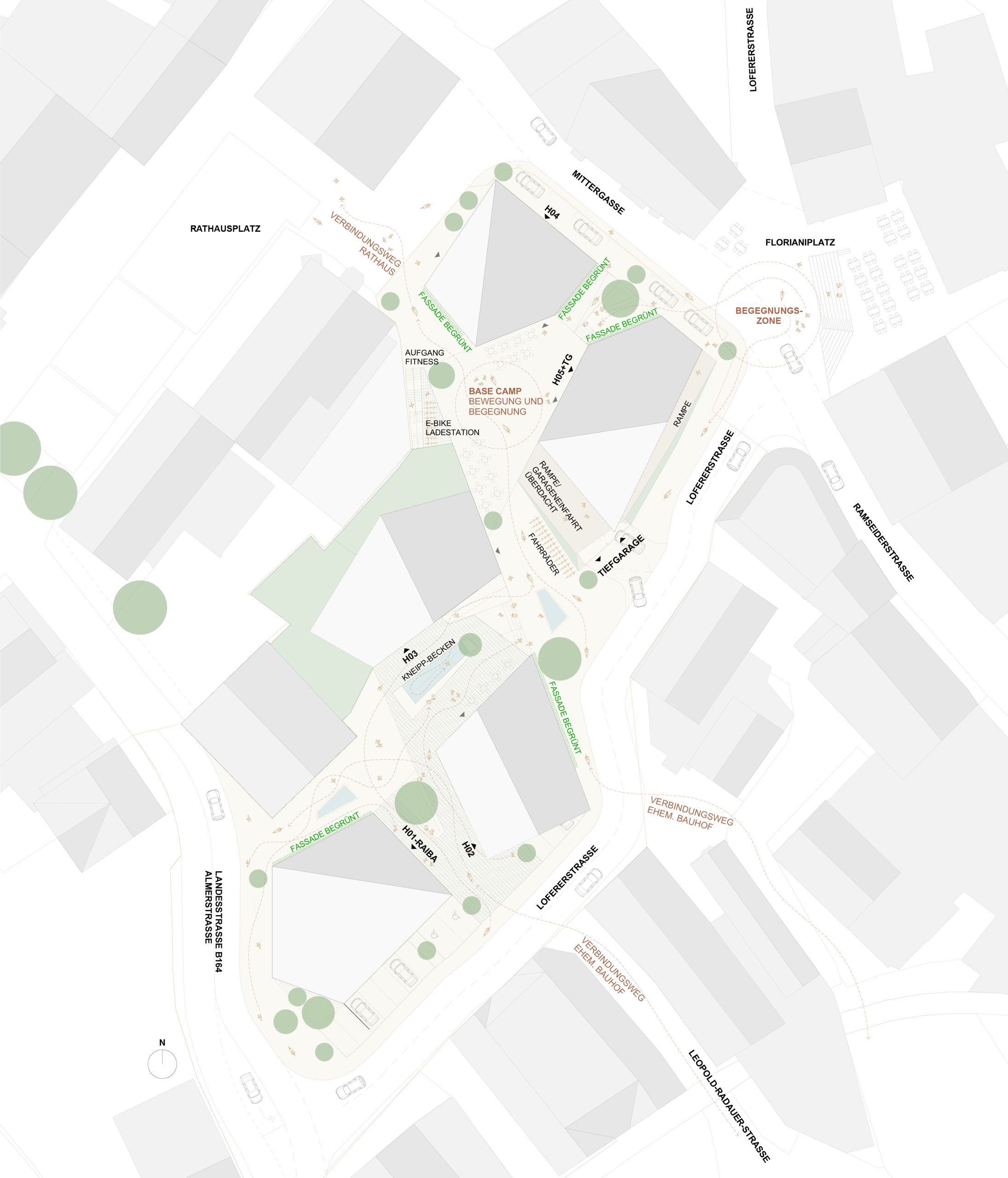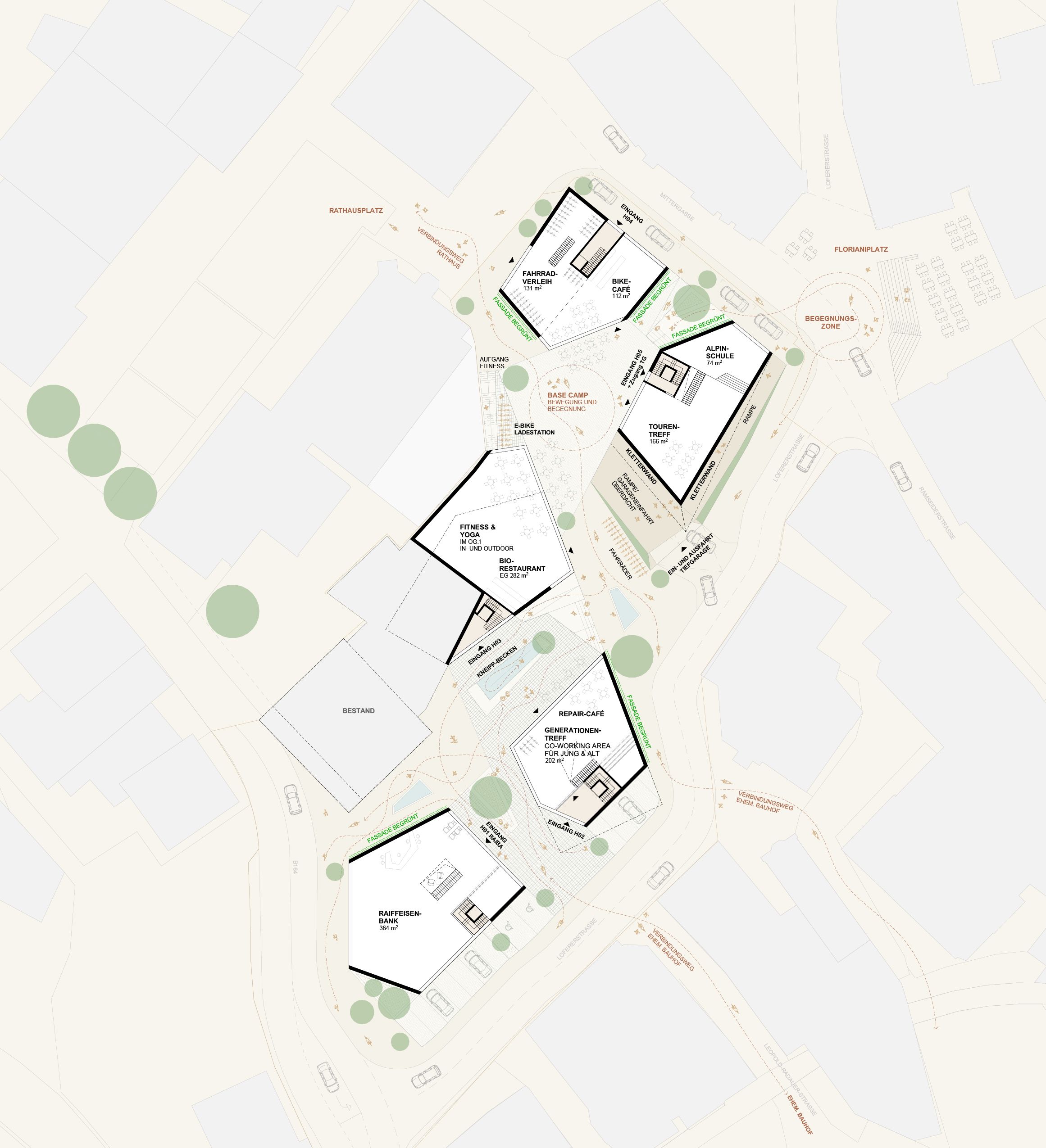 Vom Planungsgebiet ausgehend sollen sich Einrichtungen zu den Schwerpunkten Begegnung, Bewegung, Tourenplanung und Ausrüstung, Entspannung, Gesundheit, Körperbewusstsein und Ernährung zusammenfinden. Diese öffentlichen Nutzungen erstrecken sich im Innen- und Außenraum je nach Erfordernis von den Erdgeschoßzonen bis zu den Dächern.