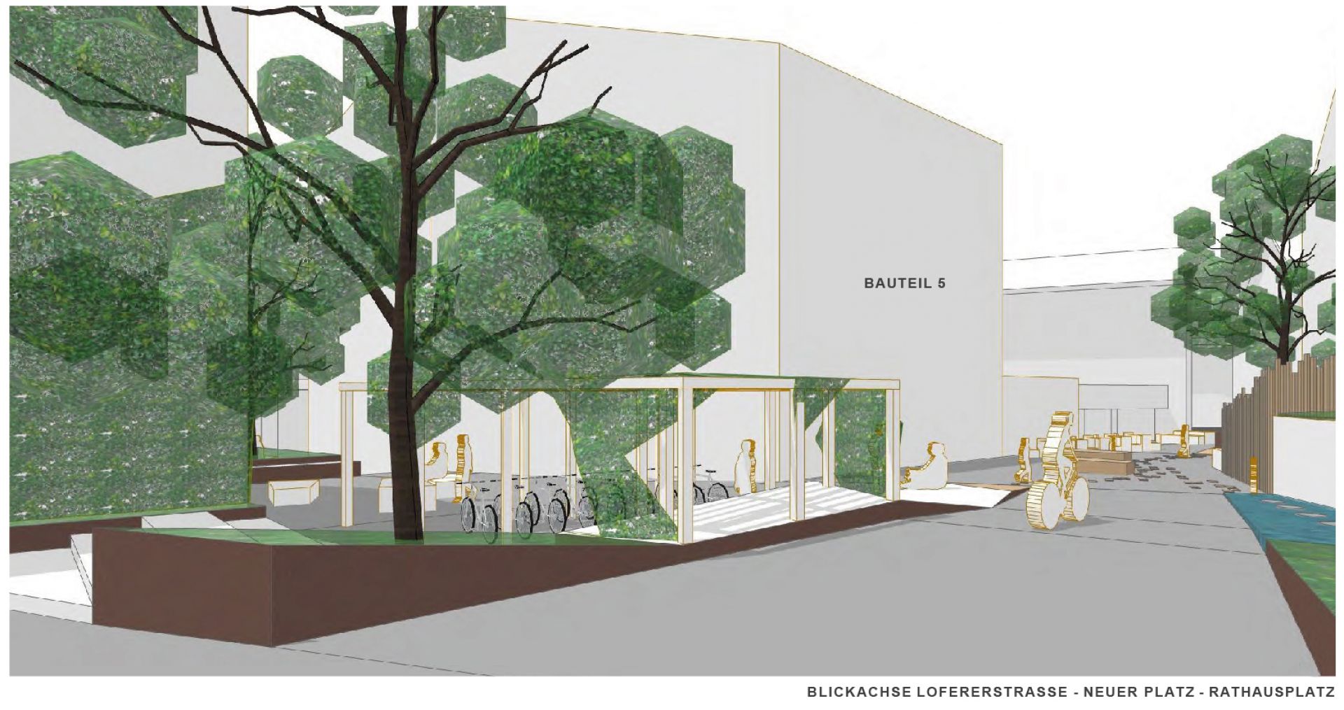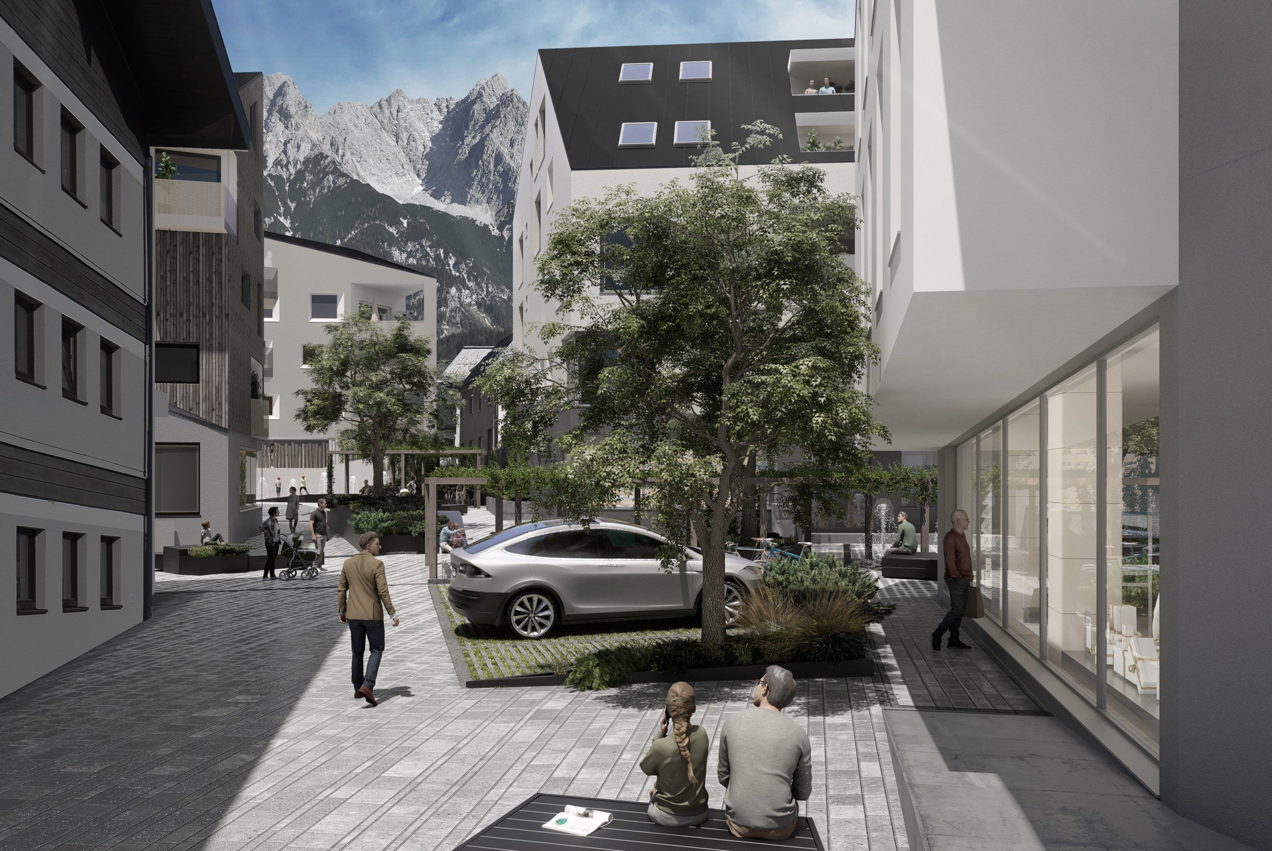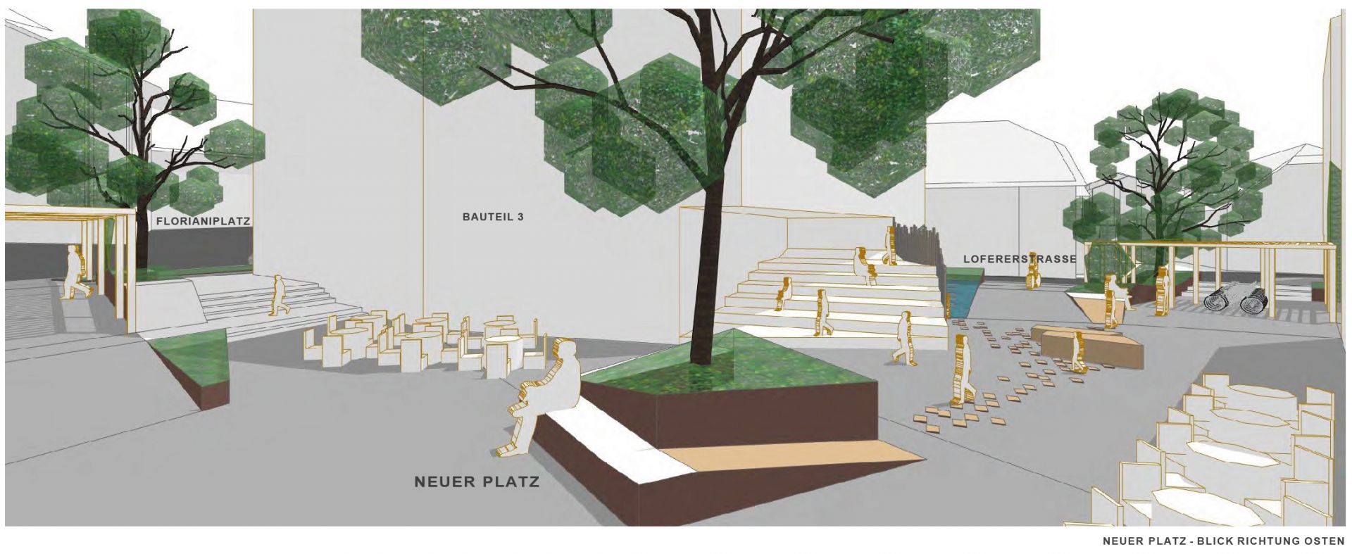 Der Stadtraum wird als Bewegungs- und Aufenthaltsraum nutzbar gemacht. Die Übergänge zwischen Innen- und Außenräumen sind fließend. Eingeschoßige Flachdächer zwischen den Gebäuden werden als Fitnessbereiche und Spielflächen genutzt. Die Tiefgaragenrampe wird zum begehbaren Außenraum und schafft Zugang zu einer kleinen Übungskletterwand. Ein Kneippbecken findet genauso seinen Platz wie Gastgärten, Sitzstufen, Pflanzen und Fahrräder. Für E-Bikes gibt es eine öffentliche, überdachte Ladestation. Das Alltags- und Freizeitradfahren soll gefördert werden und den gebührenden Platz im öffentlichen Raum bekommen.