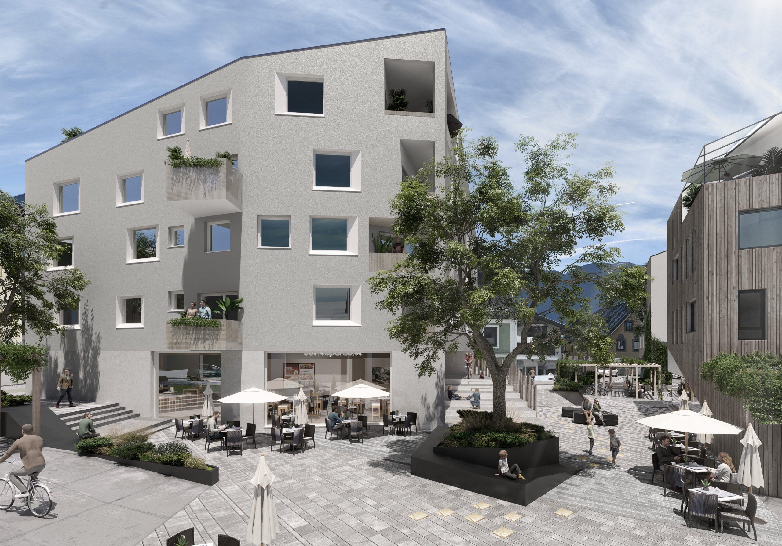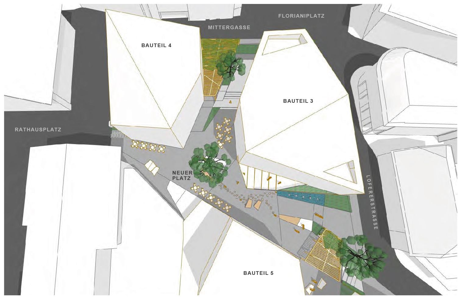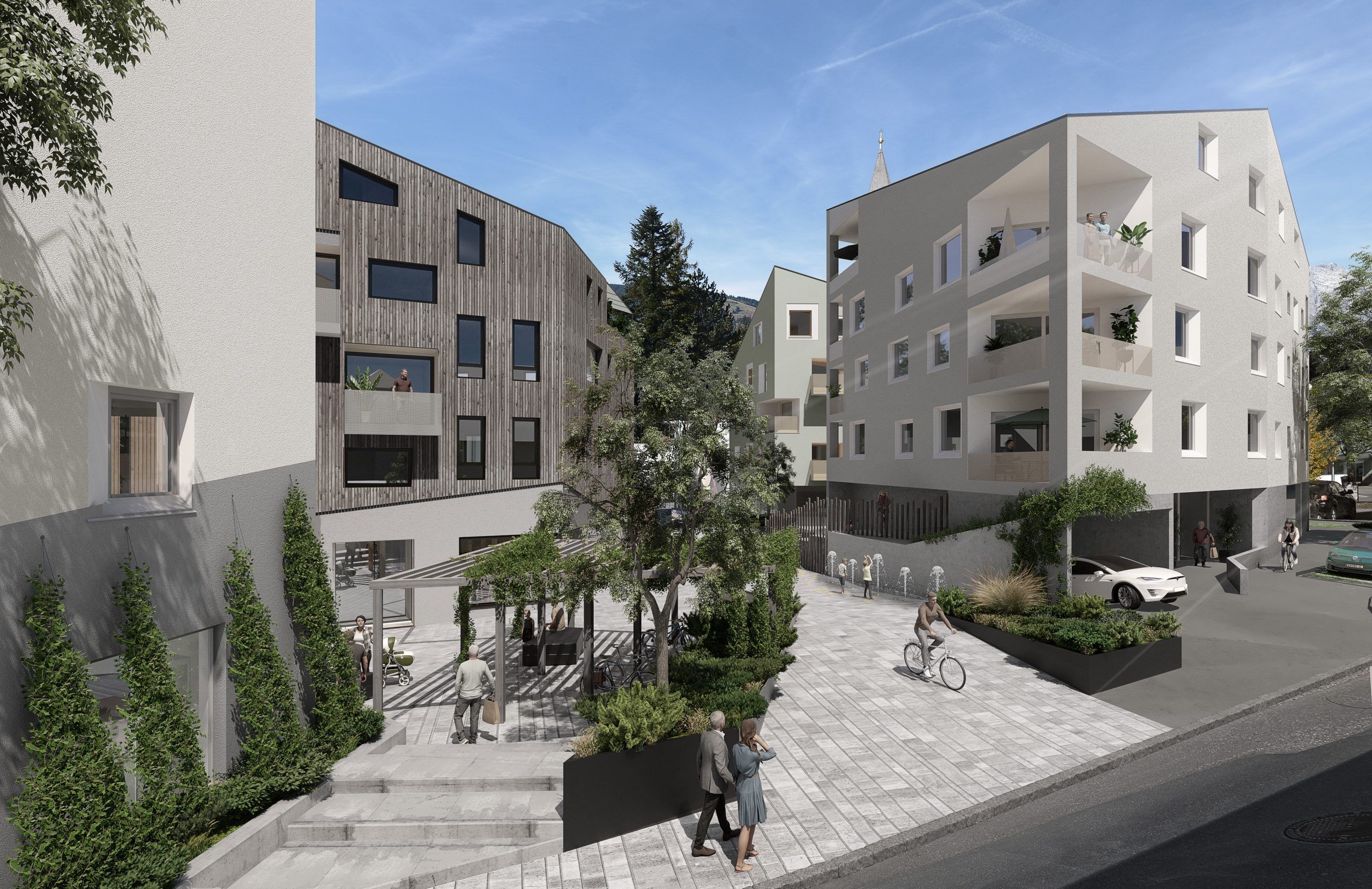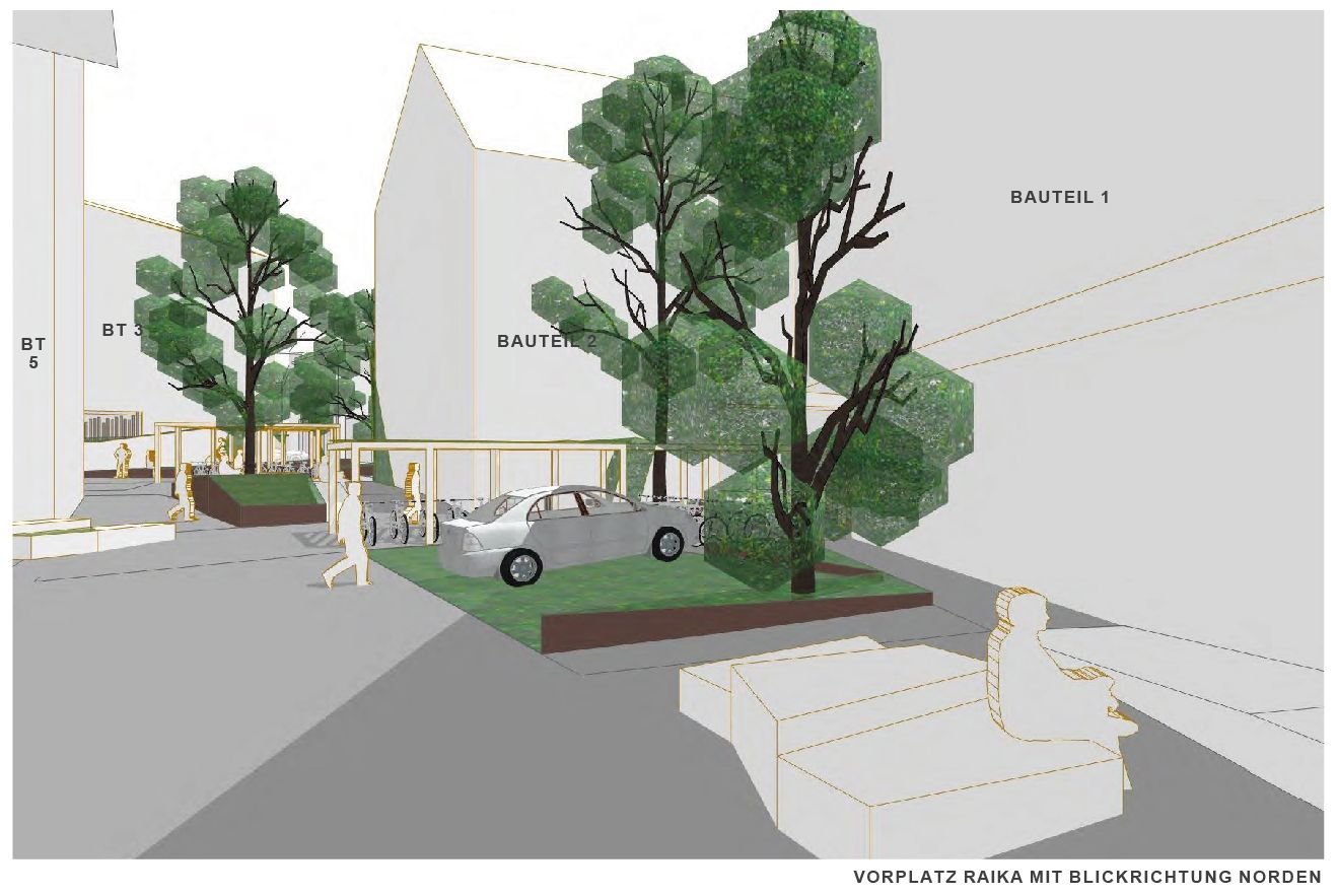 Der Stadtraum wird als Bewegungs- und Aufenthaltsraum nutzbar gemacht. Die Übergänge zwischen Innen- und Außenräumen sind fließend. Eingeschoßige Flachdächer zwischen den Gebäuden werden als Fitnessbereiche und Spielflächen genutzt. Die Tiefgaragenrampe wird zum begehbaren Außenraum und schafft Zugang zu einer kleinen Übungskletterwand. Ein Kneippbecken findet genauso seinen Platz wie Gastgärten, Sitzstufen, Pflanzen und Fahrräder. Für E-Bikes gibt es eine öffentliche, überdachte Ladestation. Das Alltags- und Freizeitradfahren soll gefördert werden und den gebührenden Platz im öffentlichen Raum bekommen.