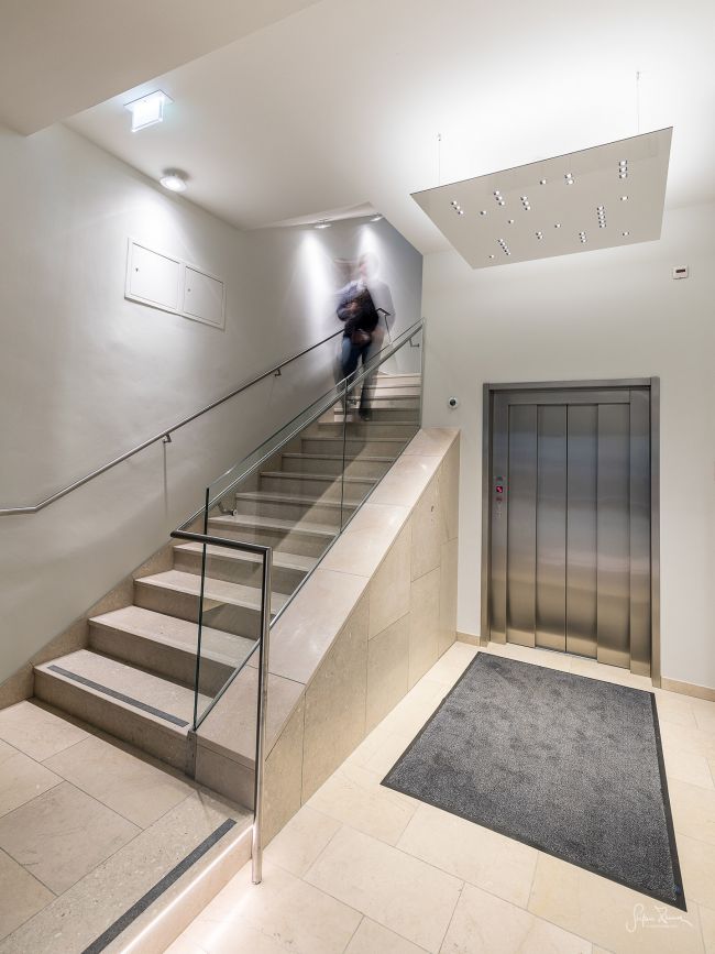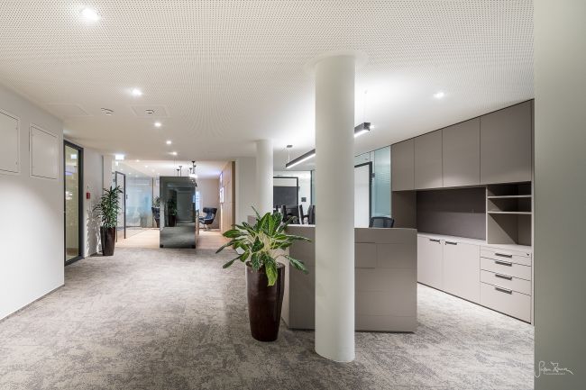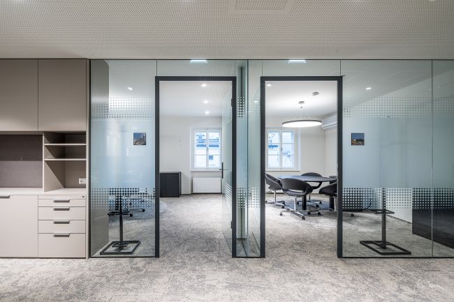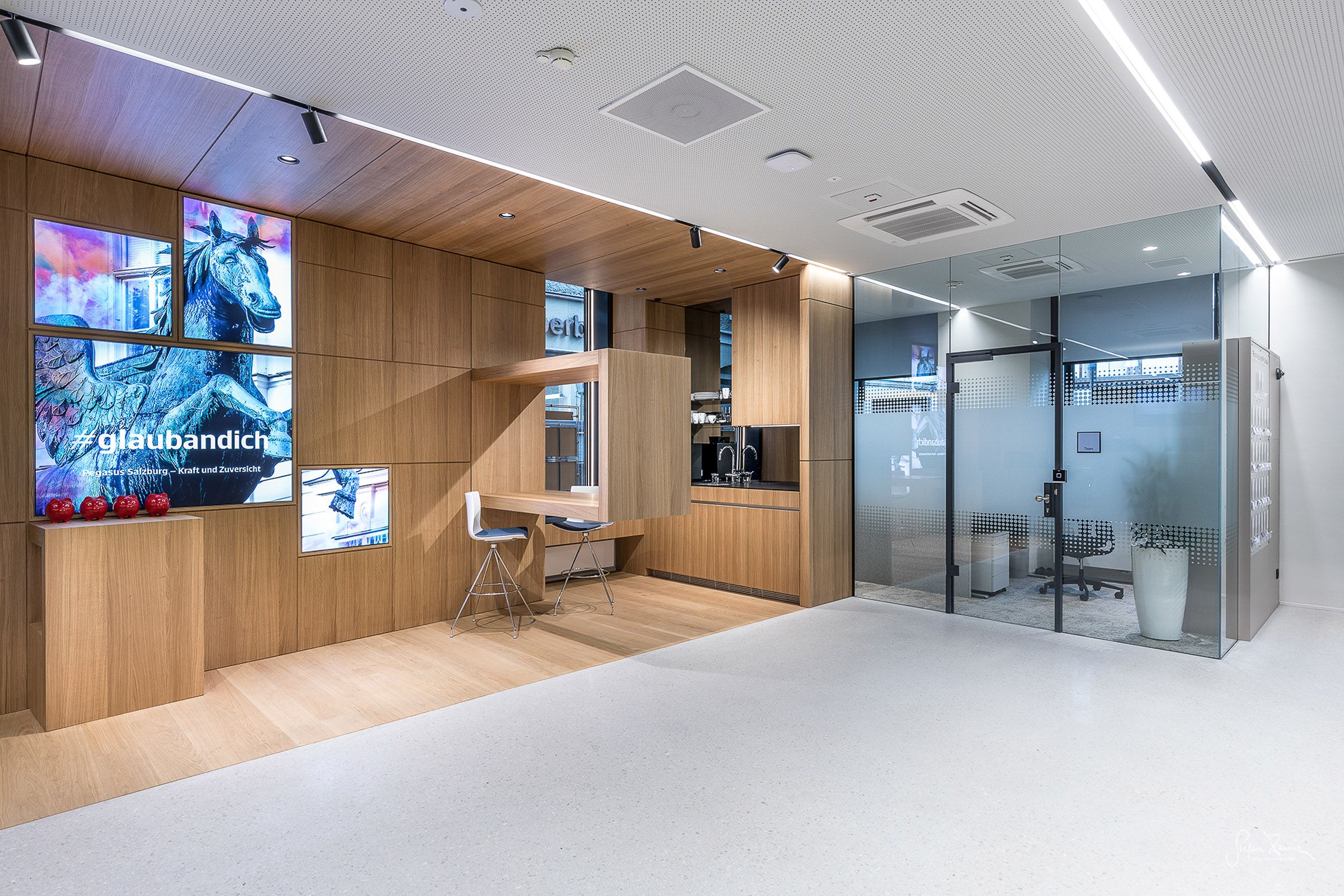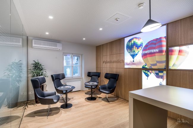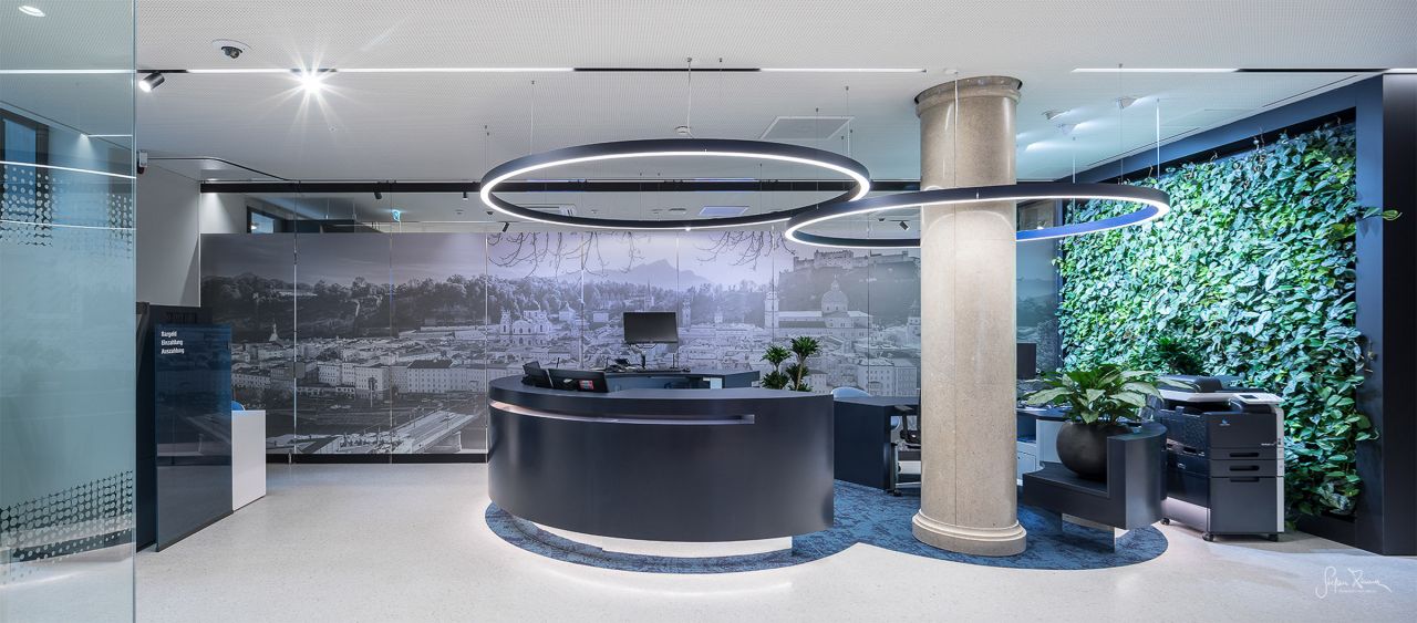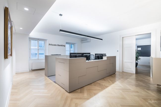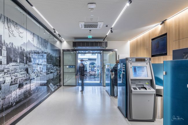 Das historische Gebäude inmitten der Salzburger Altstadt wurde in mehreren Etappen saniert und umgebaut. Neben den Beratungsräumlichkeiten, der Bankfiliale und den Kellerräumen wurde auch die Gebäude- und Sicherheitstechnik umfassend erneuert und an die zeitgemäßen Anforderungen adaptiert.