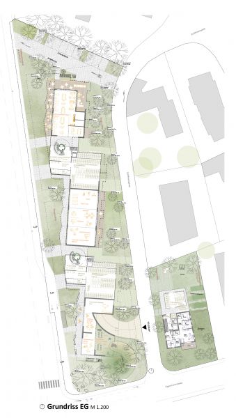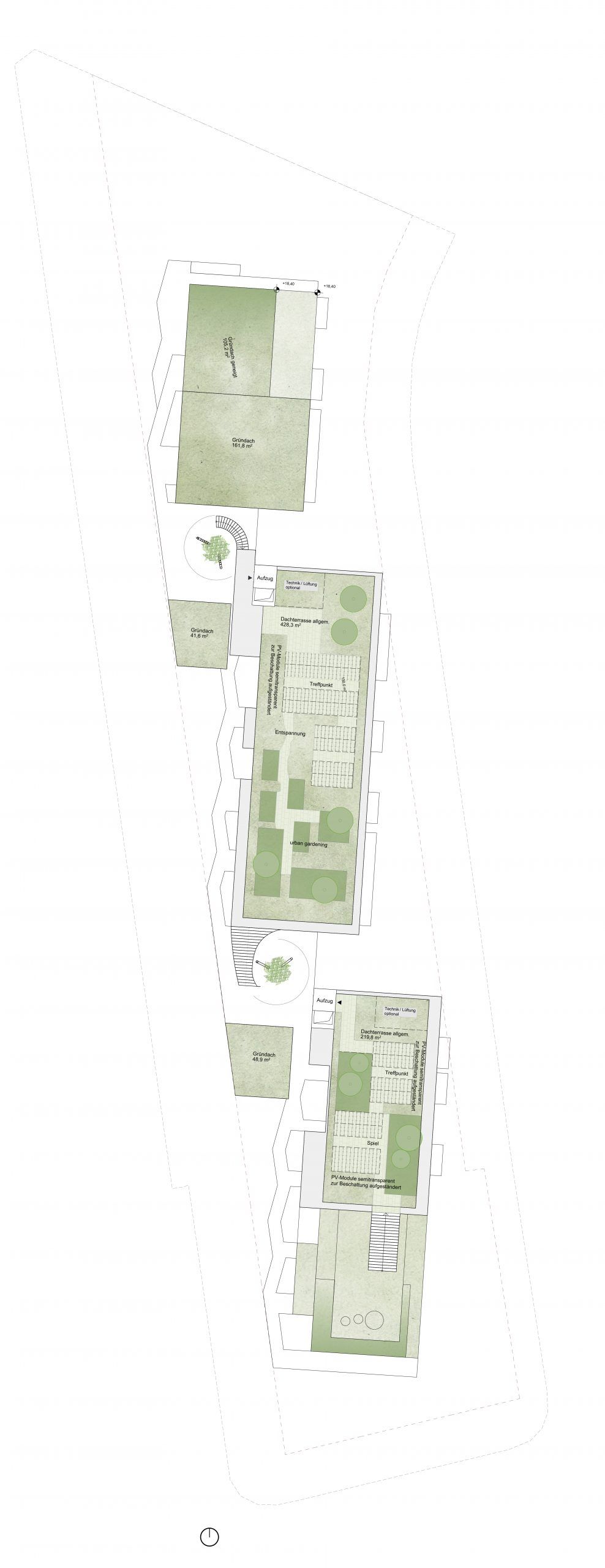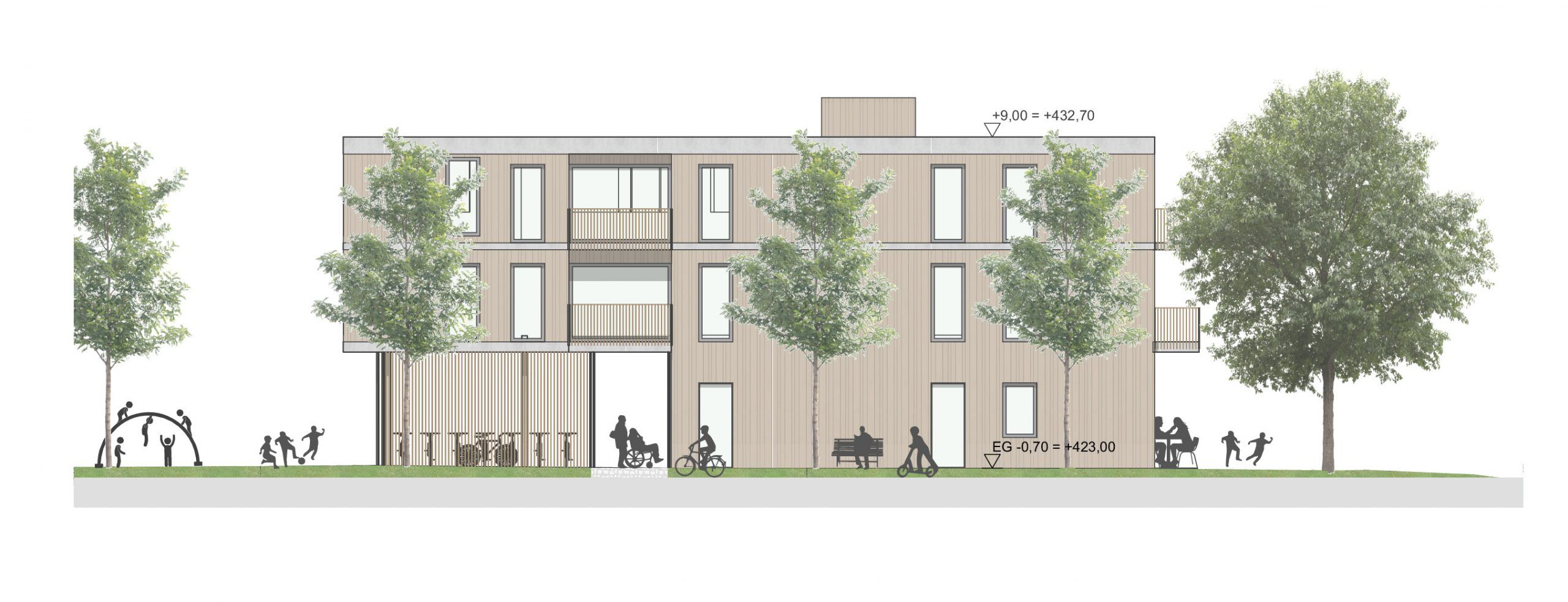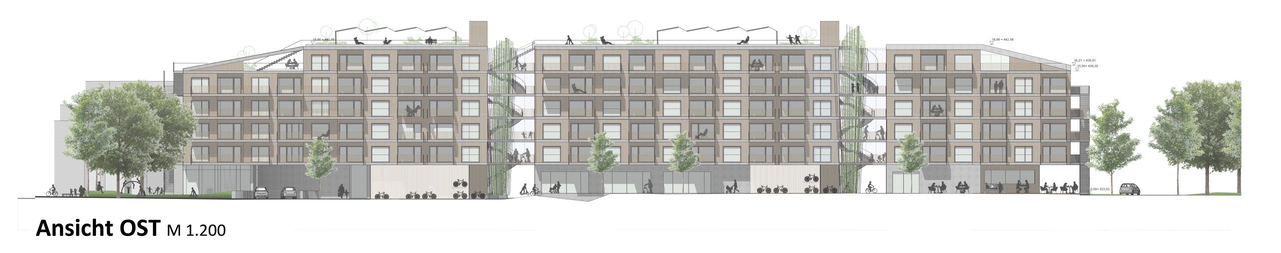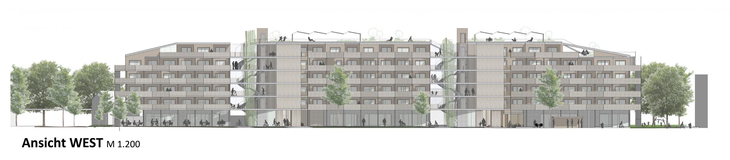 Das Freiraumkonzept sieht zwei Landschaften für zwei unterschiedliche Seiten der Bebauung vor. Richtung Alpenstraße wird eine urbane Vorzone mit attraktiver Bepflanzung der Eingangsbereiche und Erdgeschoßzonen ausgestaltet. Diese Zone trägt wesentlich zur Adressbildung der Wohnanlage bei. Auf der anderen Seite zur Schiffmanngasse verläuft ein Gartenband, das als wichtigste Grünfläche auf dem Bauplatz fungiert und das Projekt mit östlich gelegenen städtebaulichen Kleinstrukturen verknüpft. Am nördlichen Ende liegt ein Café mit attraktiven Terrassen, welches ein Ort für Treffen, Kommunikation und Austausch der Bewohner:innen ist. Als Gegenpol am südlichsten Ende befindet sich der Spielplatz mit großen Bäumen und vielfältigen Spielangeboten. Der Spielplatz ist mit Architektur und Innenraum stark verwoben und stellt ein Highlight auf dem Bauplatz dar. Das Gelände wir muldenartig ausgebildet und umfasst schützend den Spielbereich, der sich wettergeschützt in eine überdachte Erdgeschoßzone hineinzieht. Die großen Bäume bilden hier eine Grünverbindung in die Egger- Lienz-Gasse und spenden ausreichend Schatten. Auf der Dachfläche erstreckt sich eine vielfältige Dachlandschaft mit Terrassen, Spielecken, Urban Gardening, Table Commune und einem Biodiversitätsdach nach den Prinzipien von Animal aided Design. Dank der intensiv begrünten Dachflächen wird auch die Klimaresilienz der Wohnananlage gestärkt.