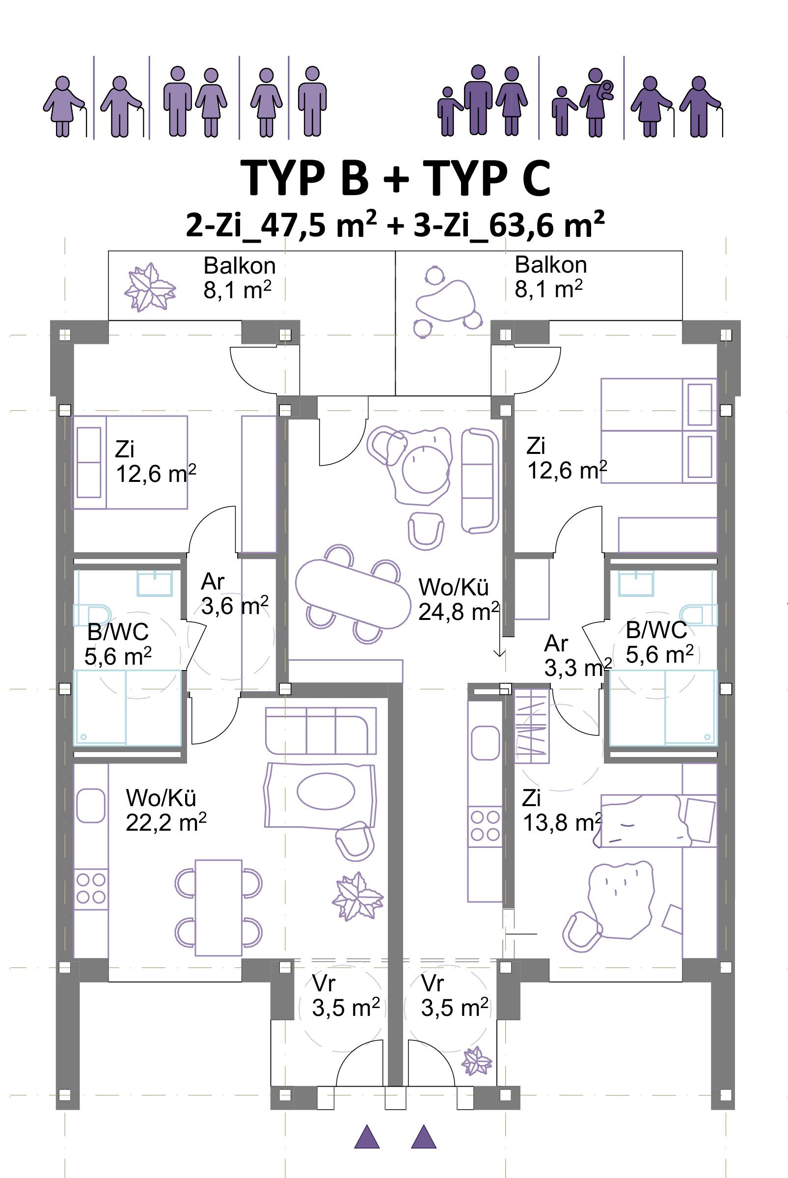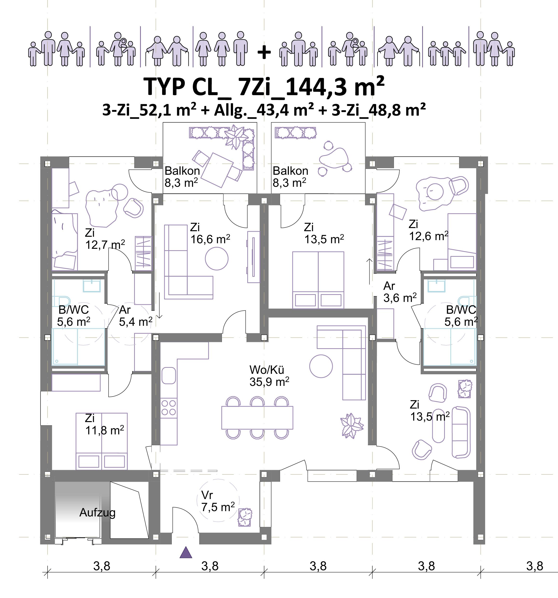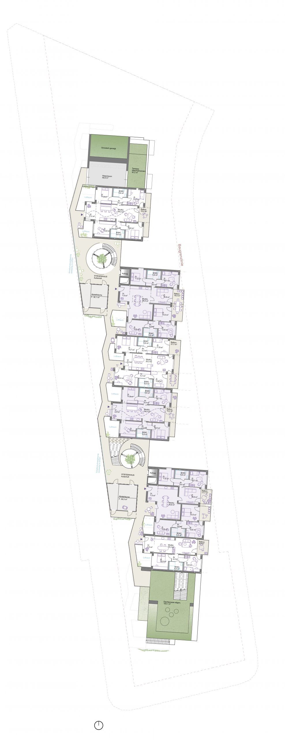 Wohnungen: Die Grundrisse sind innerhalb der Tragstruktur flexibel anordenbar, zahlreiche Umbauvarianten sind möglich. Alle Wohnungen sind durchgesteckt und orientieren sich auf beide Seiten – West und Ost. Alle Bäder sind barrierefrei und ermöglichen dadurch die Bewohnbarkeit aller Altersgruppen. Es wird empfohlen, die Wohnungen überwiegend als 3-bis 4-achsige Clusterwohnungen auszubilden. Die Cluster ermöglichen das Zusammenwohnen in unterschiedlichsten Konstellationen. Insbesondere hochwertige Gemeinschaftswohnungen mit seperaten Bädern für Zusammenlebende mit Ansprüchen an Privatsphäre und Raumqualität sind in Salzburg nicht vorhanden. Aufgrund des hohen Preisniveaus ist für die meisten in Salzburg Lebenden nur wenig Wohnfläche erschwinglich. Hochwertige Wohngemeinschaften ermöglichen es für Erwachsene, Berufstätige, Alleinerziehende oder ältere Menschen zusätzlich zum privaten Rückzugsraum ein größeres Raumangebot durch Gemeinschaftsräume leistbar zu machen.
