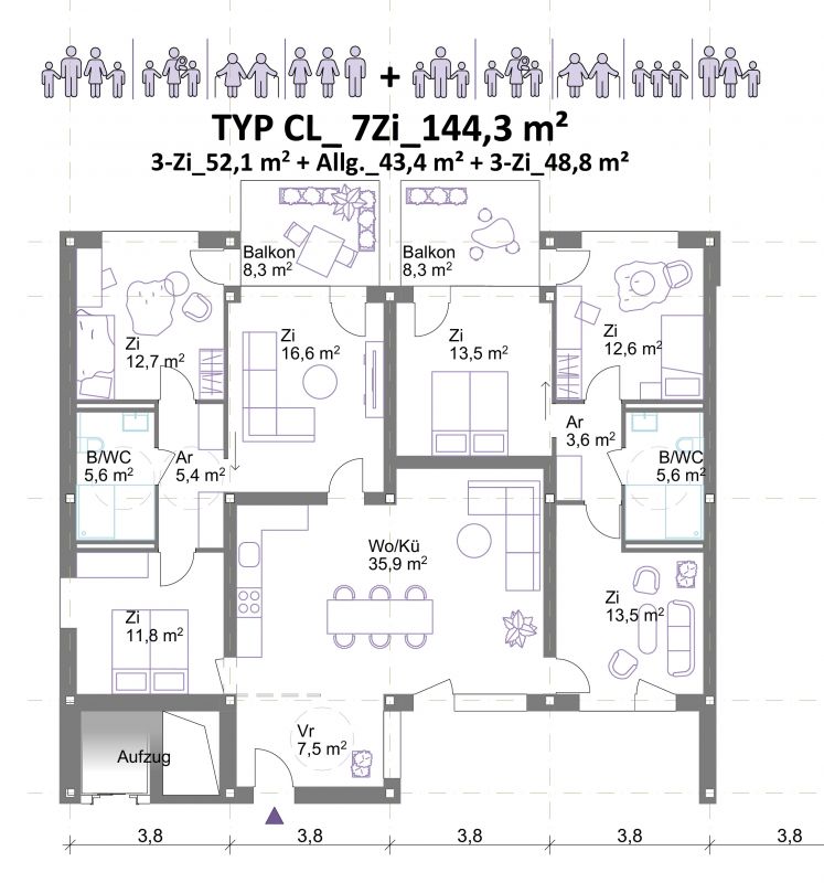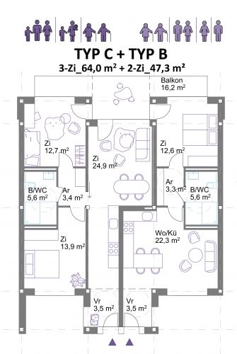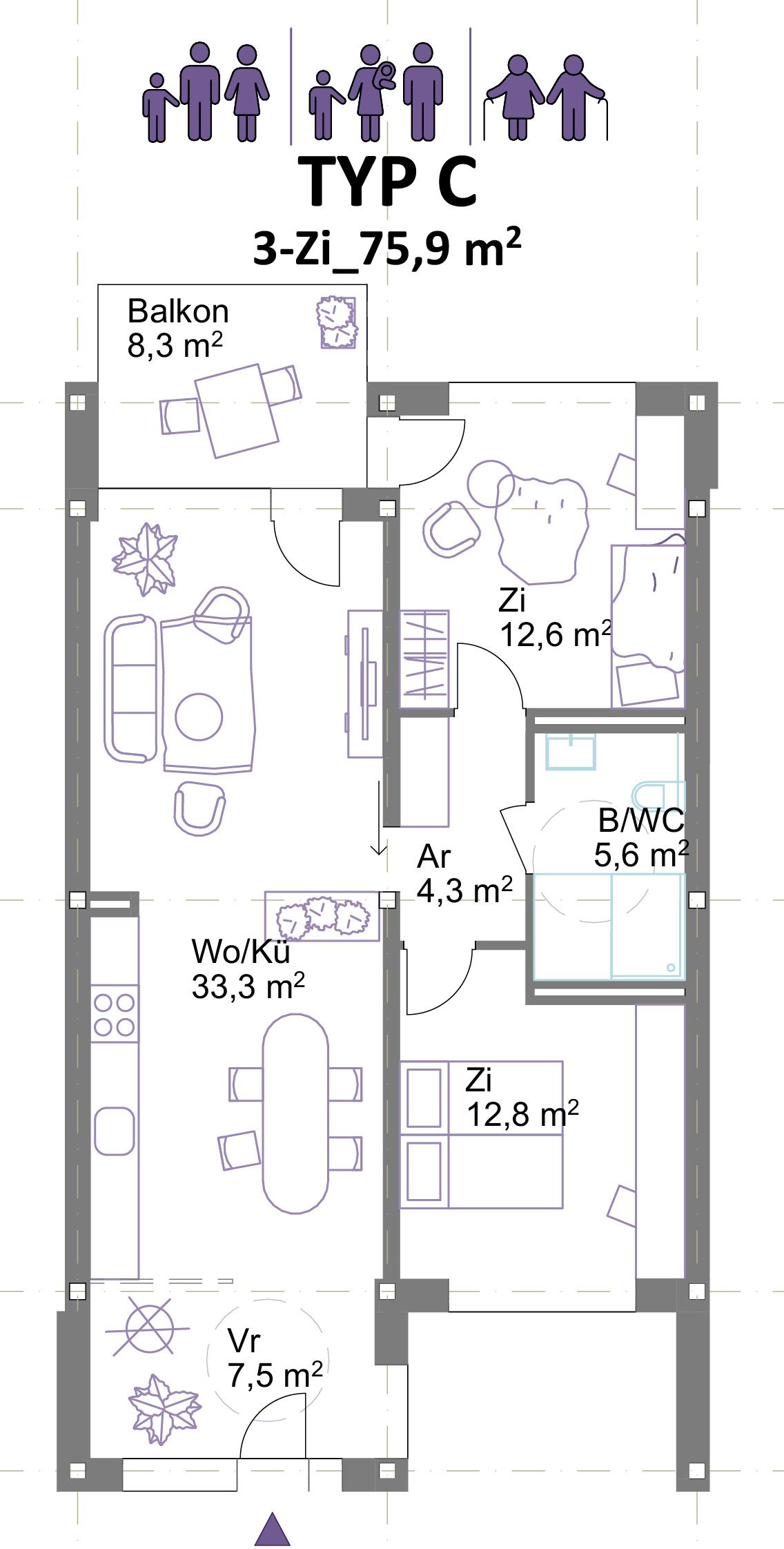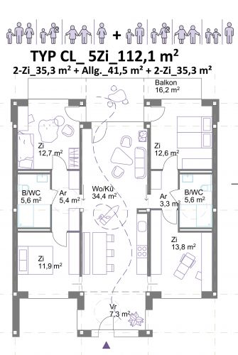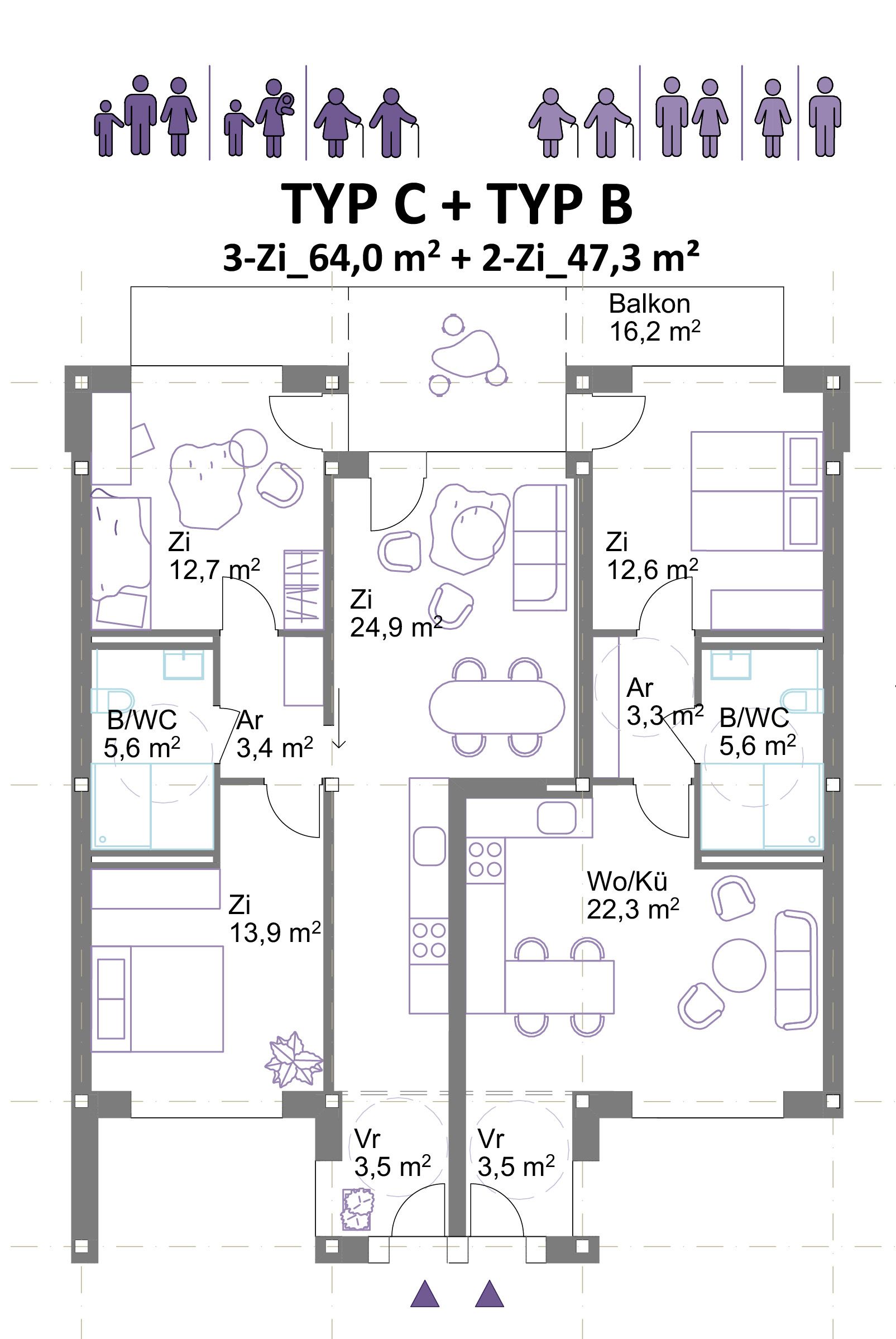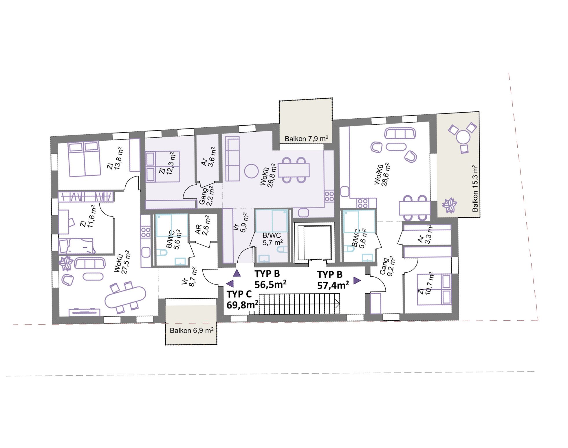 Wohnungen: Die Grundrisse sind innerhalb der Tragstruktur flexibel anordenbar, zahlreiche Umbauvarianten sind möglich. Alle Wohnungen sind durchgesteckt und orientieren sich auf beide Seiten – West und Ost. Alle Bäder sind barrierefrei und ermöglichen dadurch die Bewohnbarkeit aller Altersgruppen. Es wird empfohlen, die Wohnungen überwiegend als 3-bis 4-achsige Clusterwohnungen auszubilden. Die Cluster ermöglichen das Zusammenwohnen in unterschiedlichsten Konstellationen. Insbesondere hochwertige Gemeinschaftswohnungen mit seperaten Bädern für Zusammenlebende mit Ansprüchen an Privatsphäre und Raumqualität sind in Salzburg nicht vorhanden. Aufgrund des hohen Preisniveaus ist für die meisten in Salzburg Lebenden nur wenig Wohnfläche erschwinglich. Hochwertige Wohngemeinschaften ermöglichen es für Erwachsene, Berufstätige, Alleinerziehende oder ältere Menschen zusätzlich zum privaten Rückzugsraum ein größeres Raumangebot durch Gemeinschaftsräume leistbar zu machen.