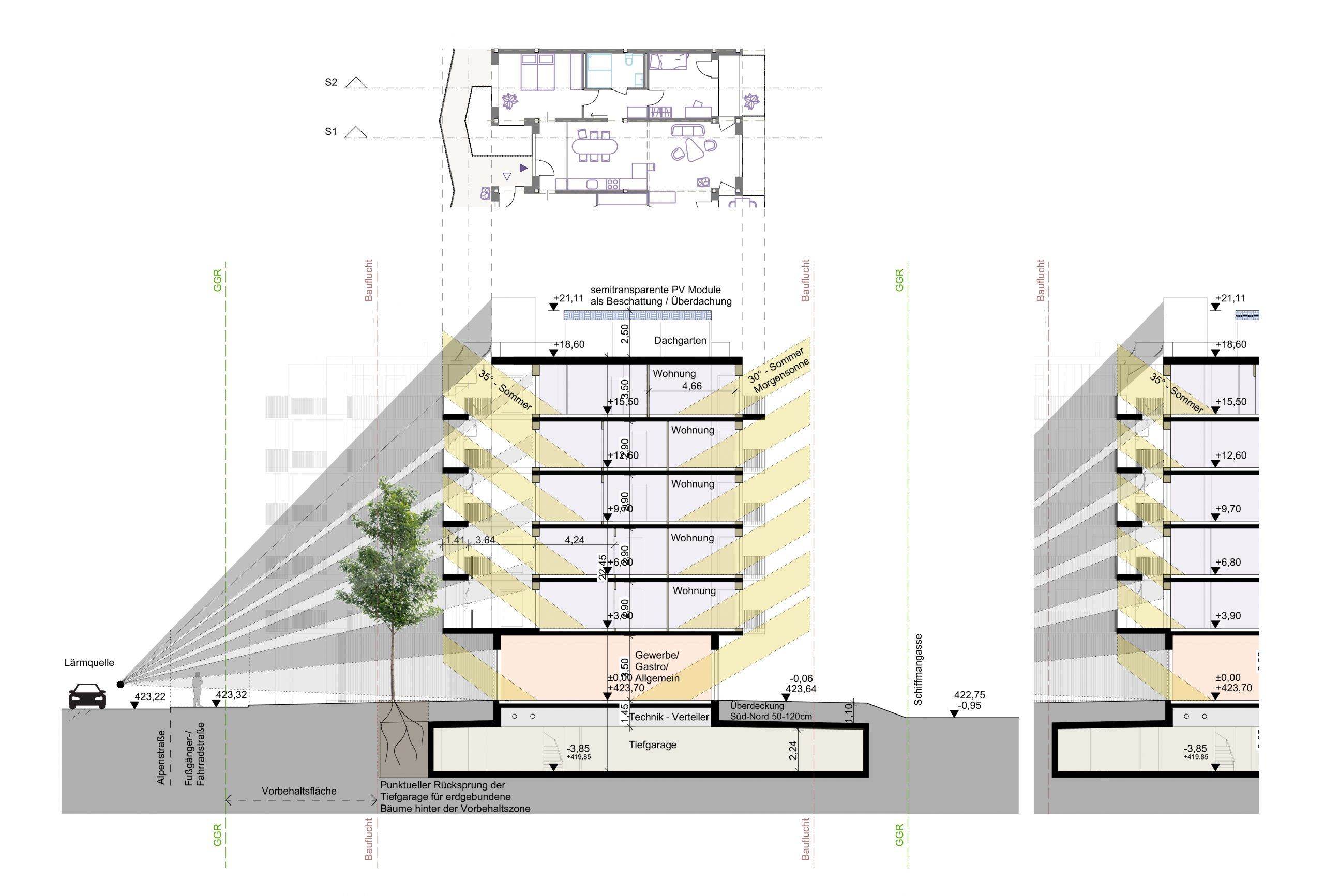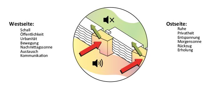 Das Projekt vermittelt zwischen der lärmbelasteten Alpenstraße im Westen und einer ruhigen Wohngegend im Osten.