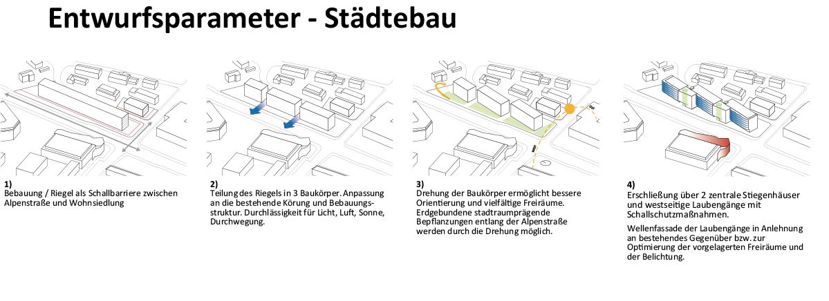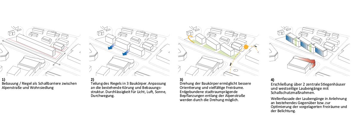 Der gesamte Bau wird als Schallschutzbarriere zur Straße hin ausgebildet. Die Bebauung am Grundstück Alpenstraße 67 wird in drei Einzelkörper gegliedert, welche gegenüber der Straßenflucht leicht verdreht sind, um bessere Orientierung der Wohnungen und interessantere Freibereiche an beiden Gebäudeseiten zu erhalten.