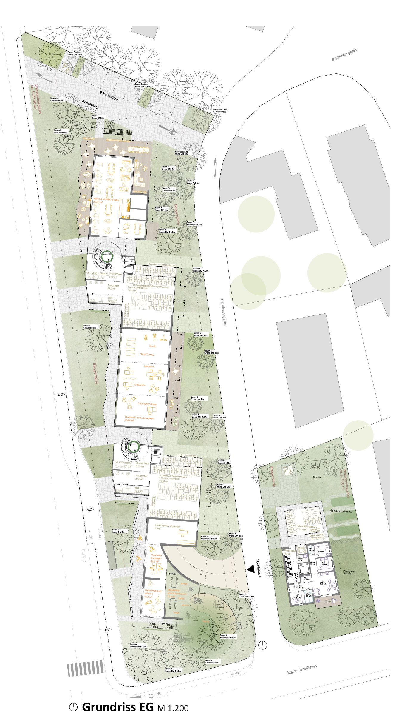 Der Baumbestand wird vollständig erhalten. Als neue Bepflanzung auf dem gewachsenen Boden dienen zum Beispiel Lederhülsenbaum (Glaedicia skyline) und Zürgelbaum (Celtis Australis) als Leitbäume sowie weitere klimaresilienten Arten, auch auf den Unterbauten mit min. 80cm Aufbau. Die Versiegelung der Oberflächen wird minimal gehalten und die Wege sind mit versickerungsteiloffenen Belägen wie Pflaster geplant. Anhand der hellen Farben werden auch die thermischen Eigenschaften der Materialien verbessert. Weitere Maßnahmen gegen Überhitzung sind großzügige Beschattung mit Hilfe von Bäumen und PV-Pergolen sowie Verdunstungsflächen mit verzögerter Versickerung zur Verbesserung des Mikroklimas. Die Fassadenbegrüngung straßenseitig und in Atrien der Stiegenhäuser erfolgt anhand der bodengebundenen Rankgerüste mit Kletterpflanzen wie einer Pfeifenwinde (Aristolochia macrophylla), Jungfernrebe (Parthenocissus tricuspidata) und Immergrünes Geißblatt (Lonicera henryi). Gemeinschaftsfläche für Urban Gardening und Treffpunkt für Kommunikation stellen die wichtigsten Freiraumelement der Wohnanlage in der Schiffgasse dar. Ein grüner Puffer schirmt das Gebäude von der Straße ab und gibt ein attraktives Erscheinungsbild.