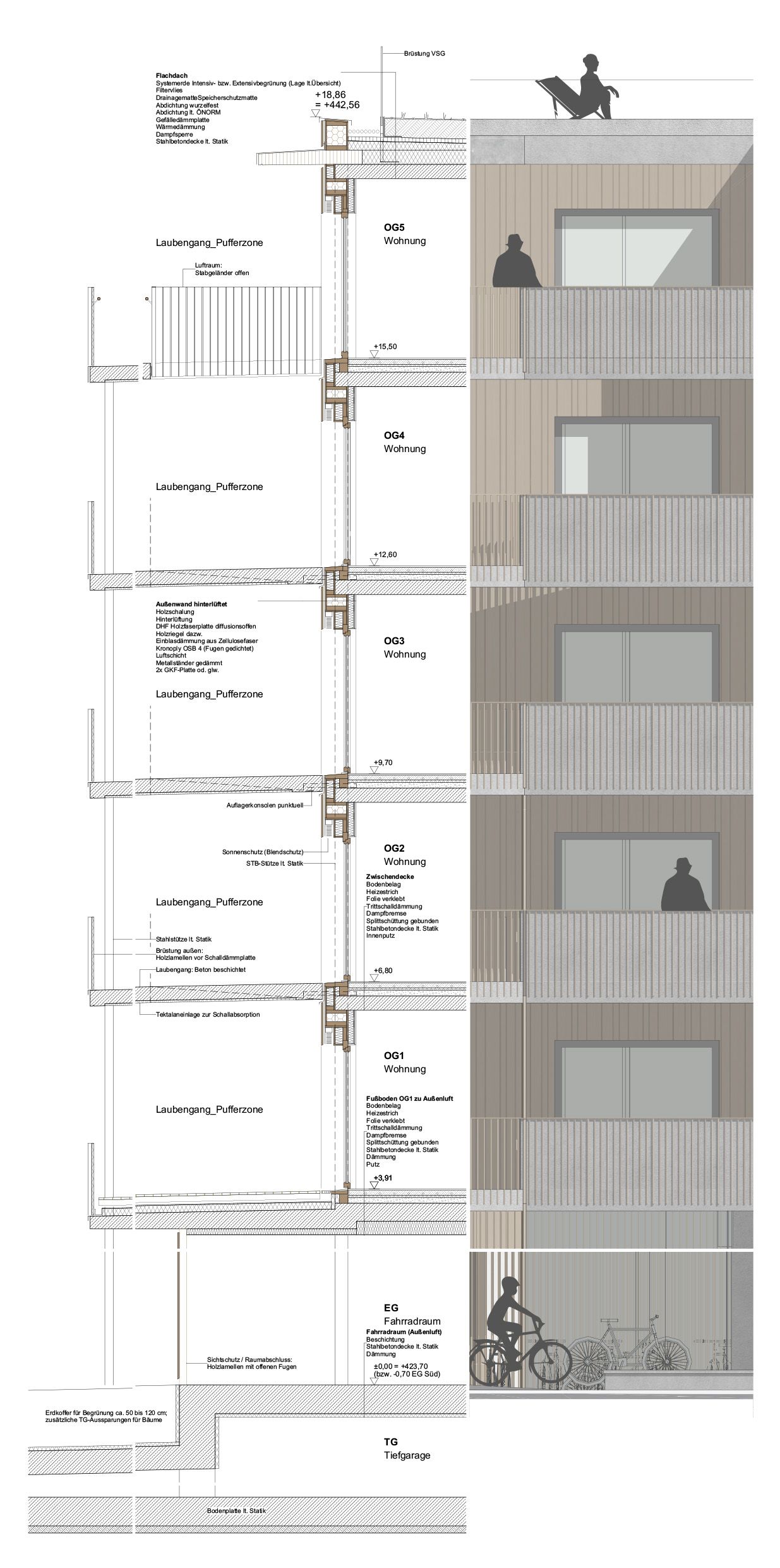 Schallschutz innerhalb und außerhalb der Wohnung: Trennwände zwischen Wohneinheiten wie auch innerhalb der Wohnungen sind hochwertig ausgestattet, um Privatsphäre zu gewährleisten. Die Betondecken gewährleisten guten Schallschutz zwischen den Geschoßen bei flexibler Anordnung der Wände. Straßenlärm wird aufgrund der absorbierenden Ausstattung der äußeren Laubengangbrüstungen noch vor den Wohnungen reflektiert bzw. absorbiert. Die zusätzliche Erfordernis von Schallschutzfenstern wäre im Detail zu prüfen. Insbesondere für die westseitigen (straßenseitigen) Wohnräume wird die Ausstattung mit kontrollierter Wohnraumlüftung empfohlen. Zur Positionierung der Lüftungsgeräte gibt es ausgewiesene Zonen auf den Dächern neben den zentralen Schächten.