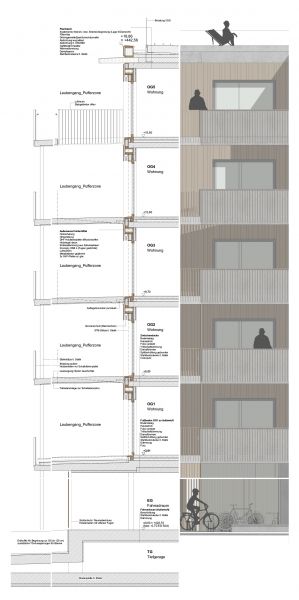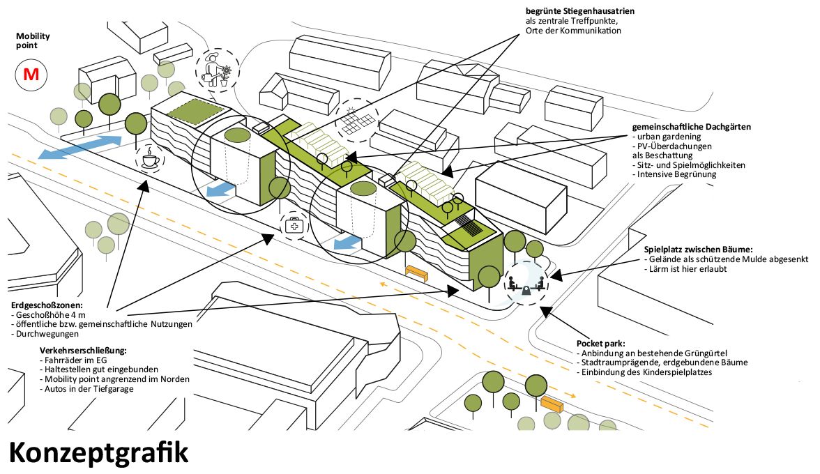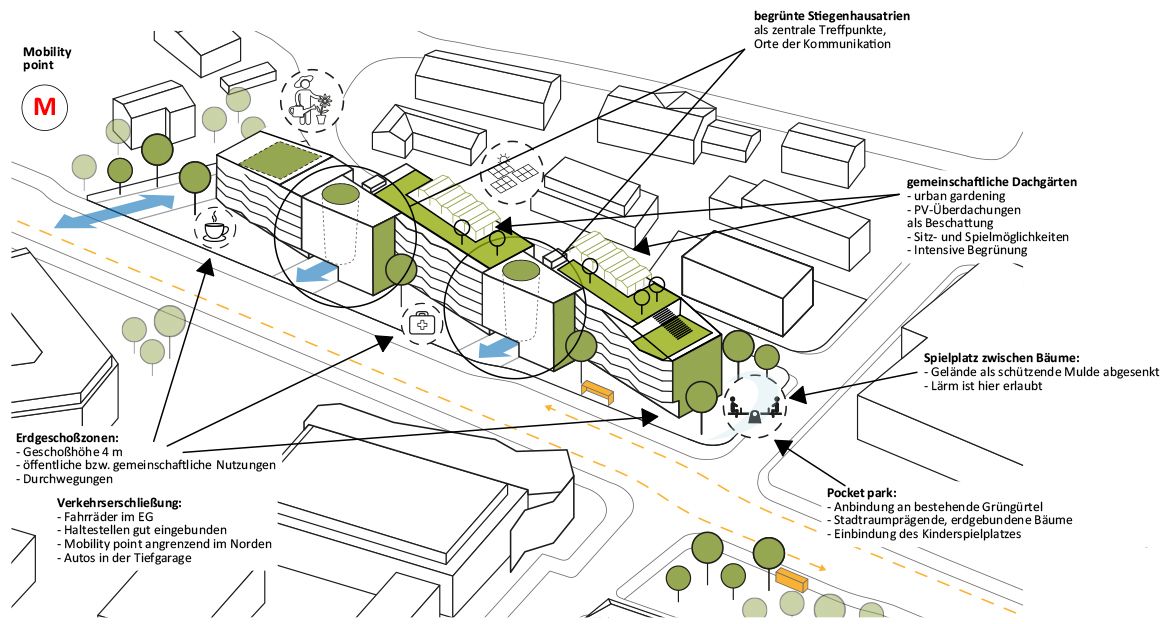 Die Planung für das neue Wohnquartier berücksichtigt die vielfältigen Herausforderungen des schmalen, lärmexponierten Bauplatzes, die aktuell besonders wichtigen Anforderungen an Nachhaltigkeit und Klimabewusstsein sowie die flexible Anpassbarkeit an die sozialen Veränderungen und Bedürfnisse der künftigen Nutzer:innen.